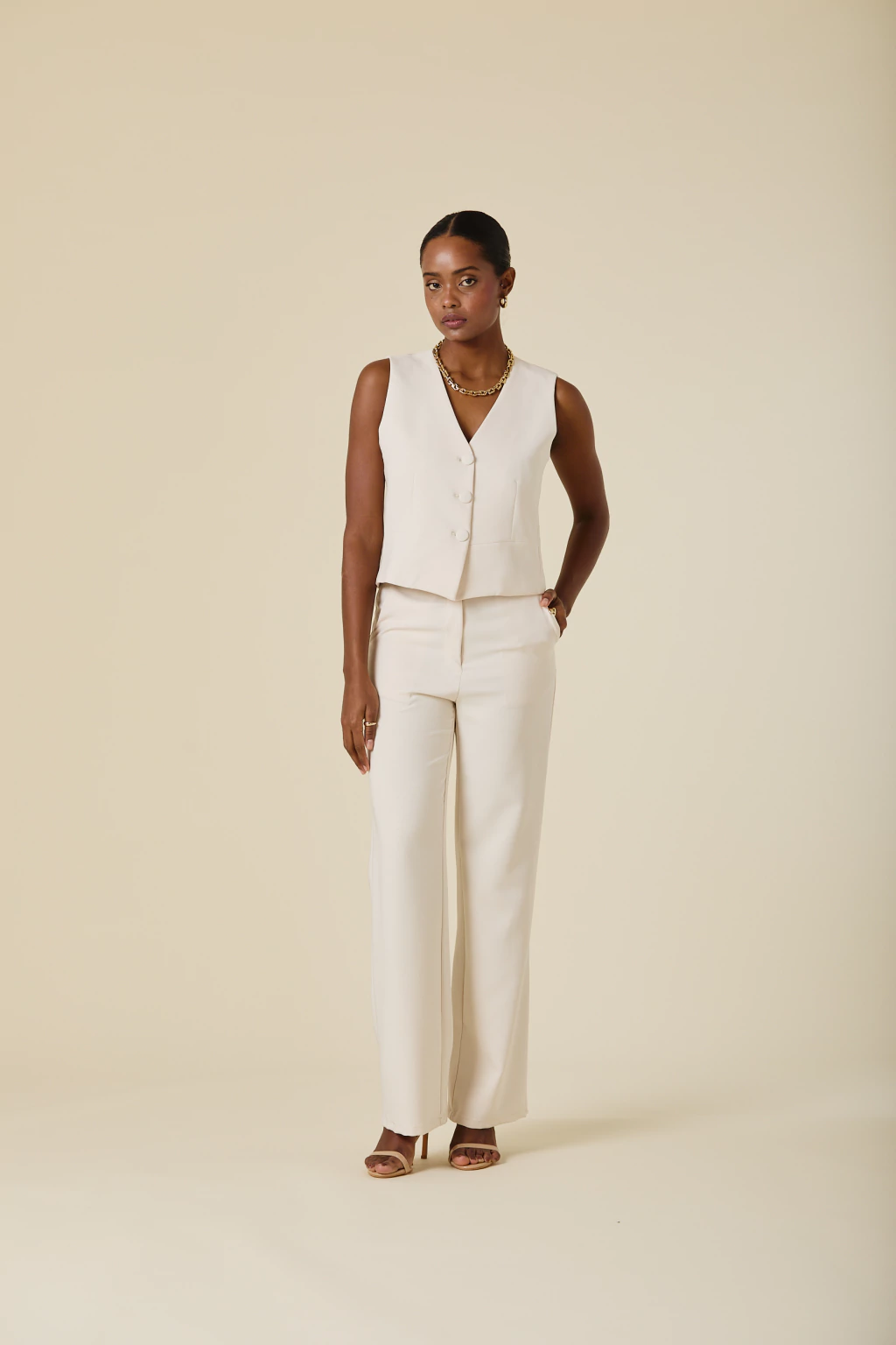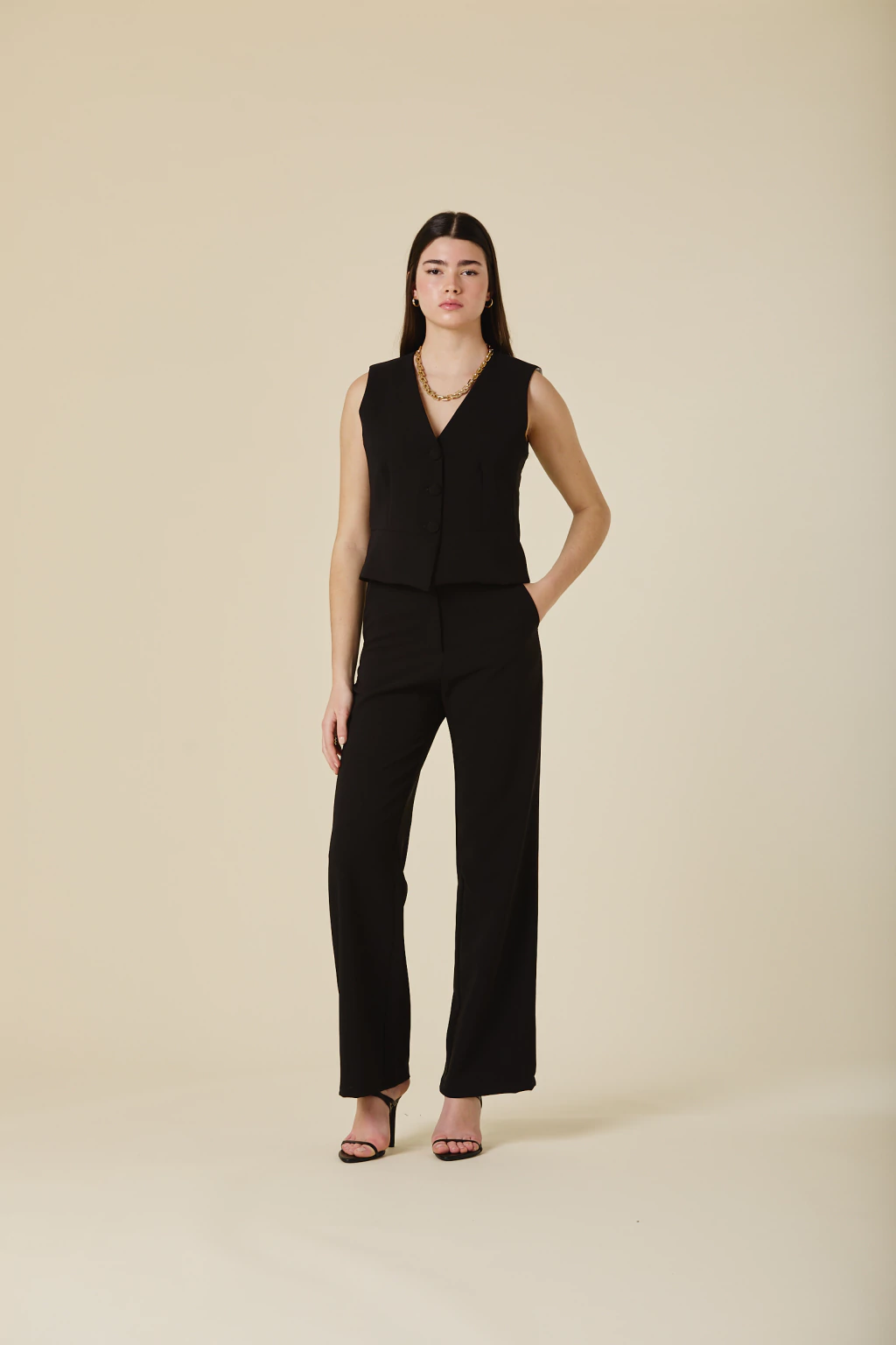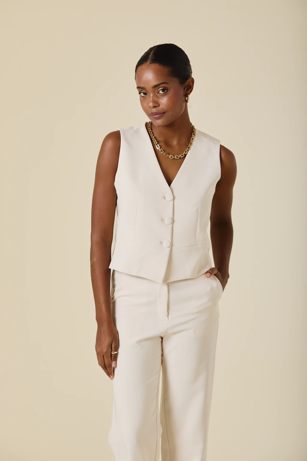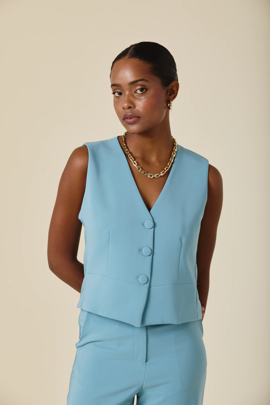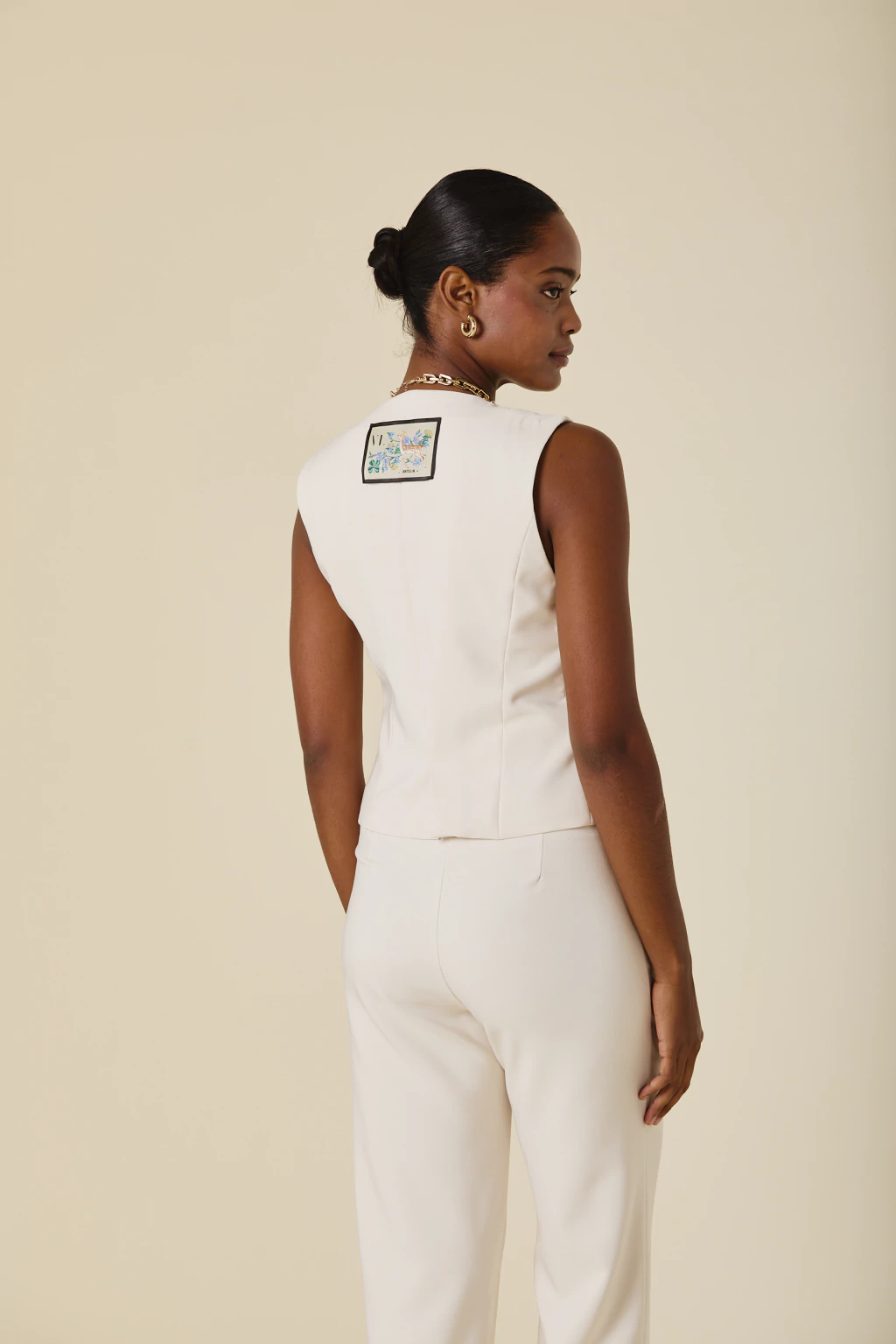 Este chaleco de crepe sastrero con forreria estampada exclusiva, es una pieza clave para elevar tu estilo. Con botones forrados al tono, su diseño aporta un equilibrio entre estructura y sofisticación, permitiendo versatilidad en distintas combinaciones. Ideal para looks formales o para agregar un toque distintivo a tu vestuario, garantizando siempre un resultado chic y refinado.