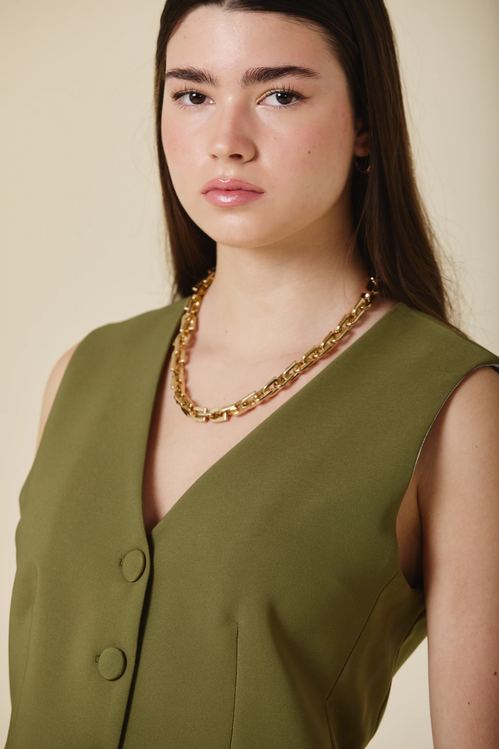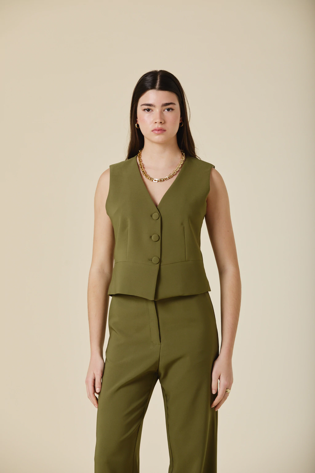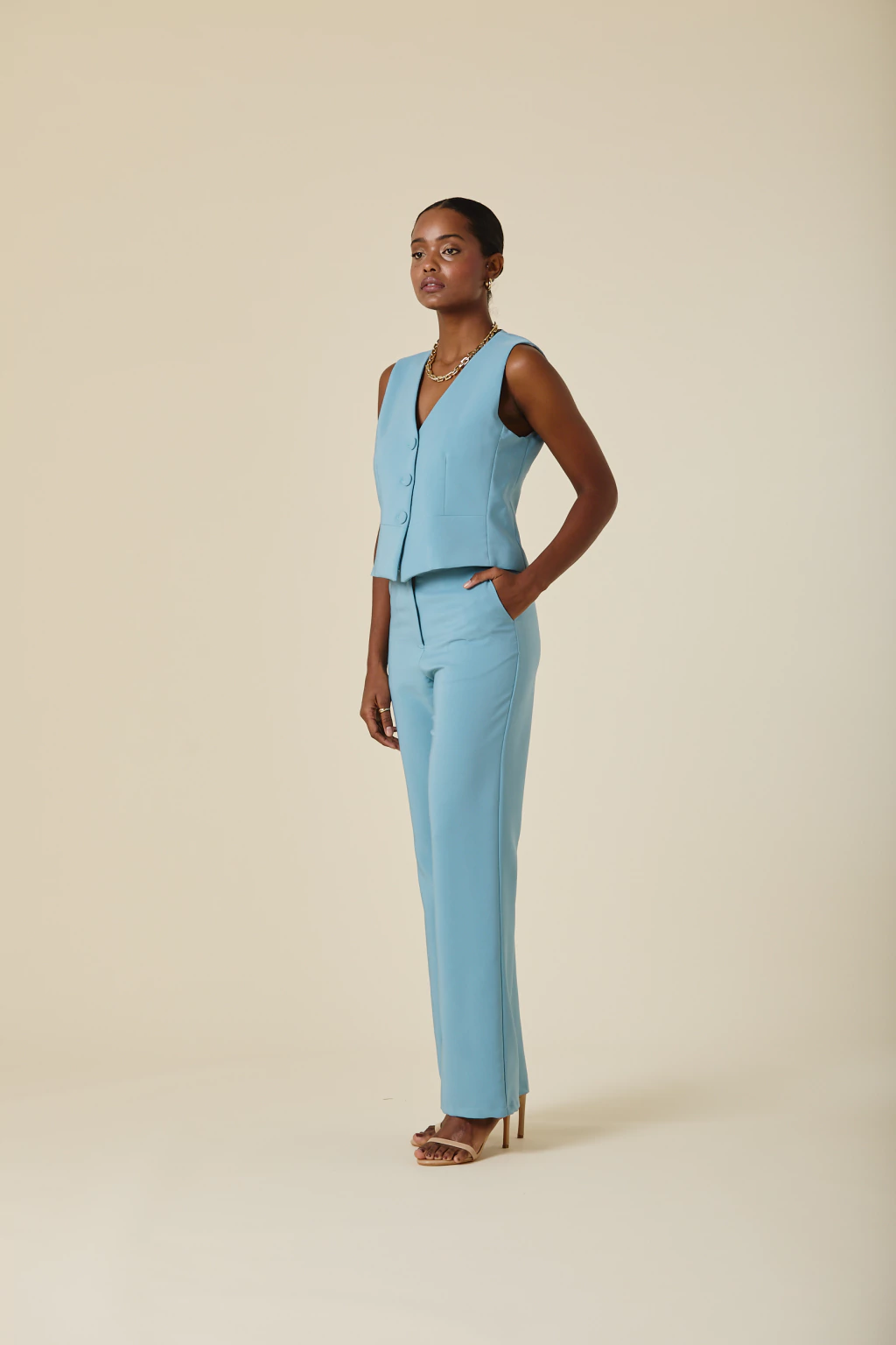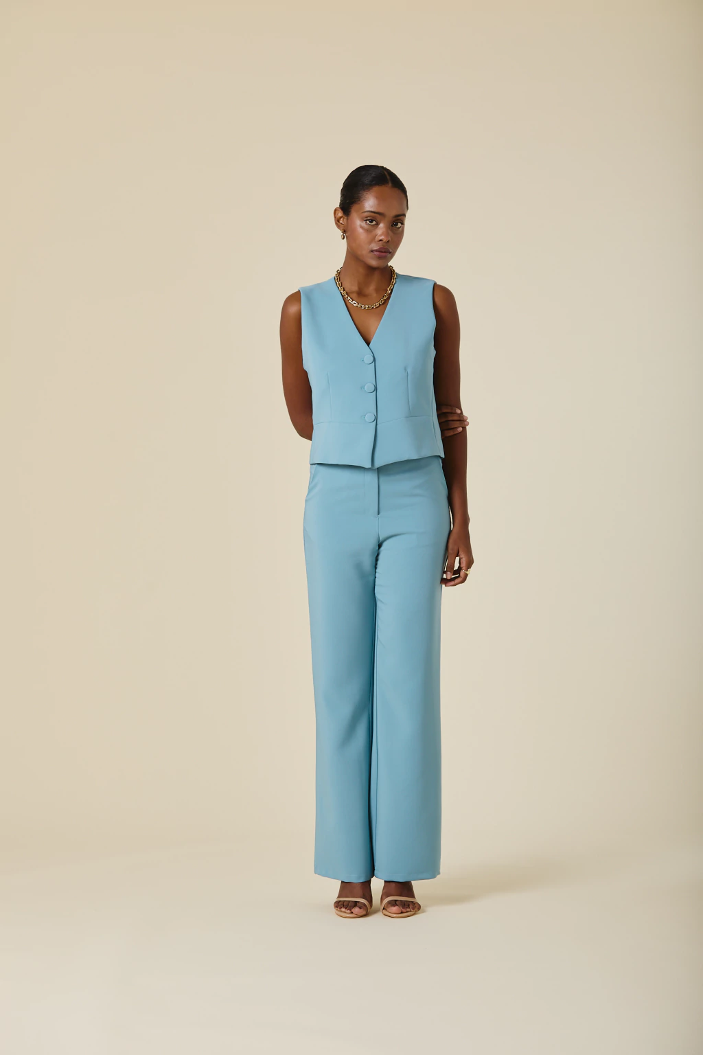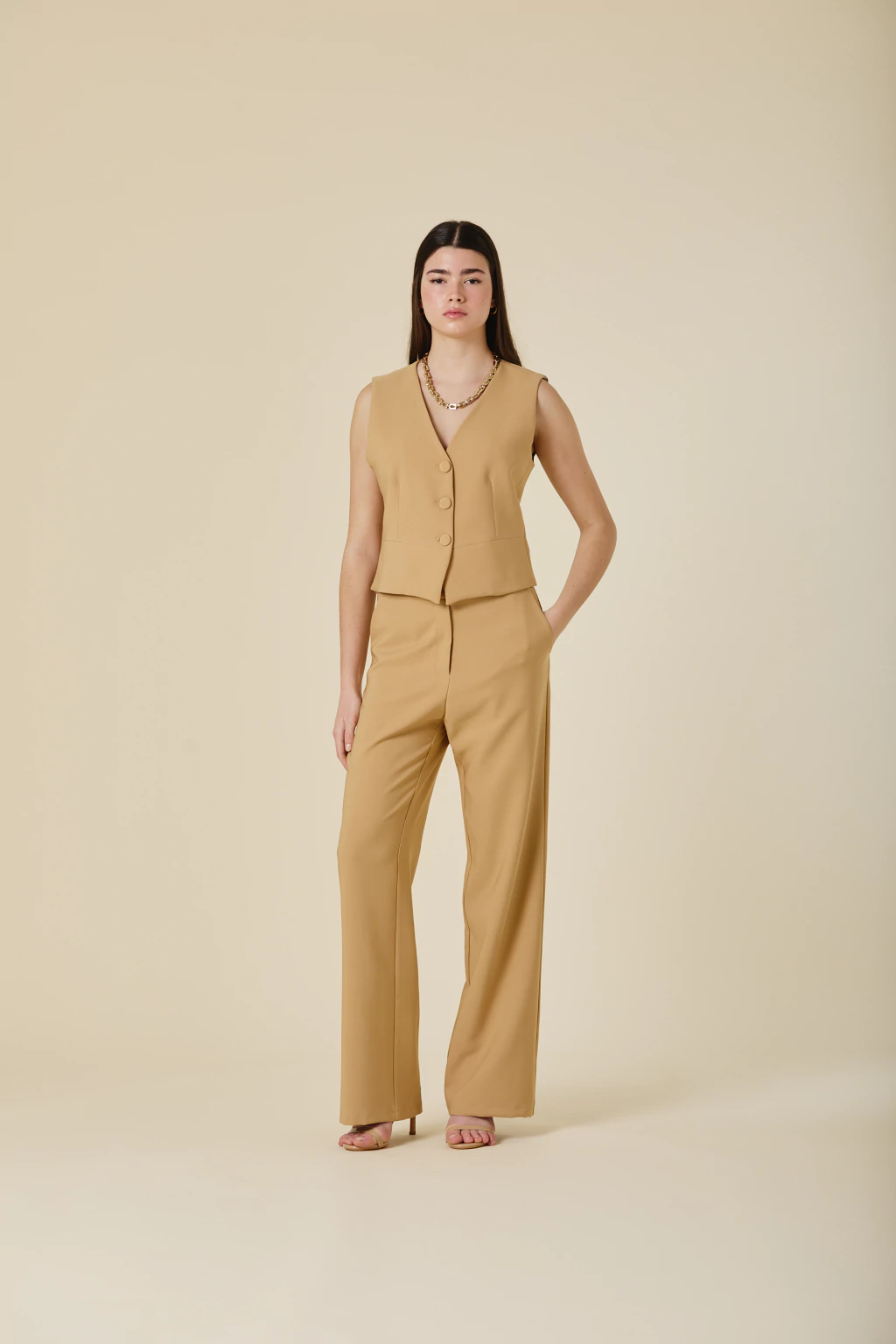 Este chaleco de crepe sastrero con forreria estampada exclusiva, es una pieza clave para elevar tu estilo. Con botones forrados al tono, su diseño aporta un equilibrio entre estructura y sofisticación, permitiendo versatilidad en distintas combinaciones. Ideal para looks formales o para agregar un toque distintivo a tu vestuario, garantizando siempre un resultado chic y refinado.