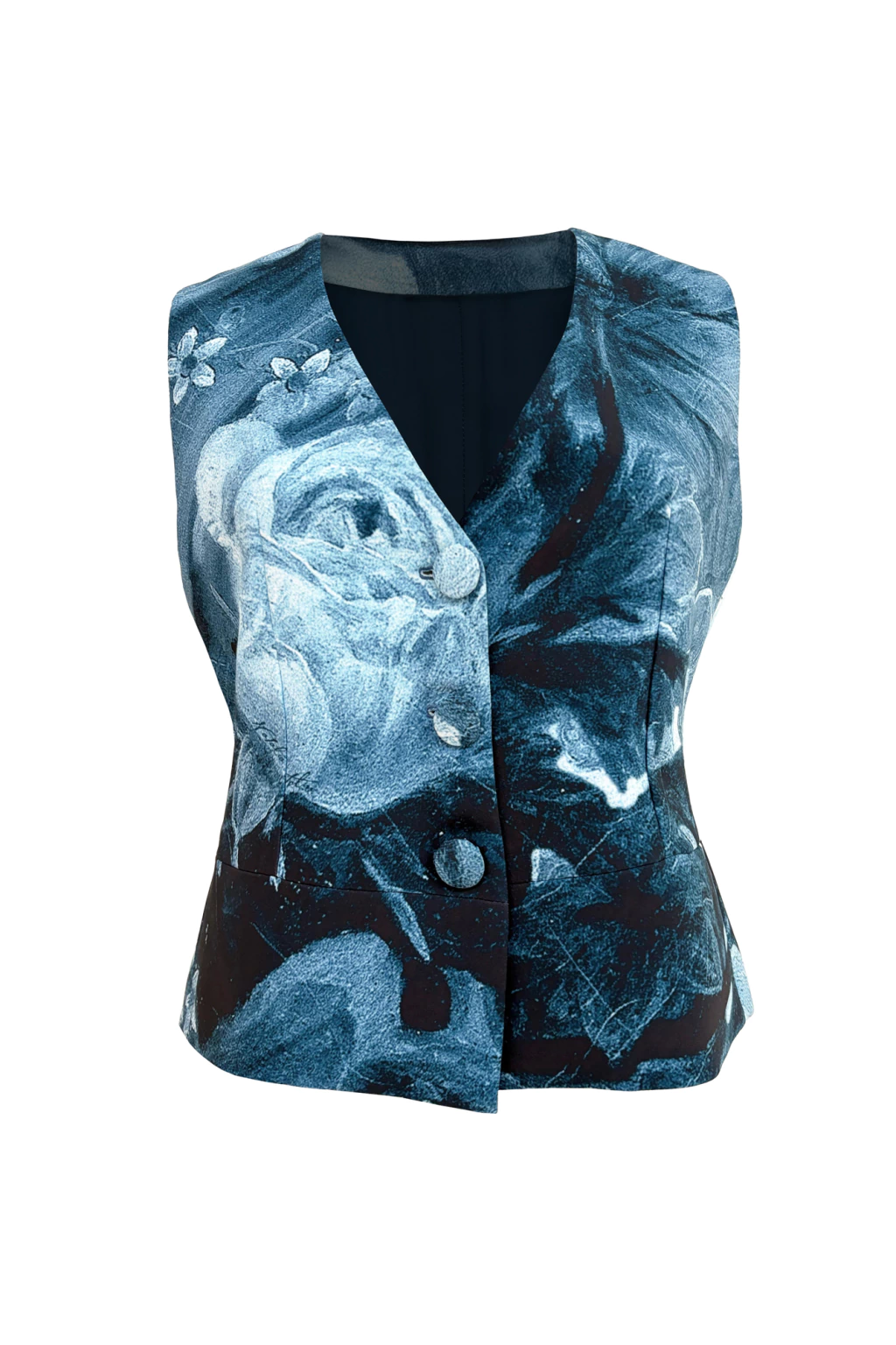 Este chaleco sastrero con estampa floral combina estructura y estilo en una prenda única. Su forrería estampada añade un detalle de distinción, mientras que los botones forrados en el mismo diseño resaltan su acabado cuidado. La modelo mide 1,72 m y usa talle S.