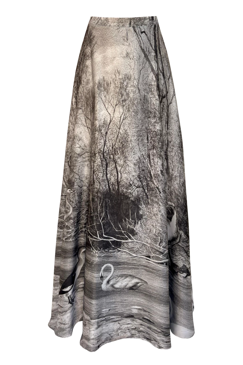 Esta falda larga de satén liviano presenta una estampa de cisnes que le otorga un toque único y elegante. Su cintura de jersey elastizado garantiza un ajuste perfecto y confort durante todo el día. Ideal para quienes buscan una prenda sofisticada y moderna, esta falda es perfecta para cualquier evento que requiera un look delicado y estilizado.