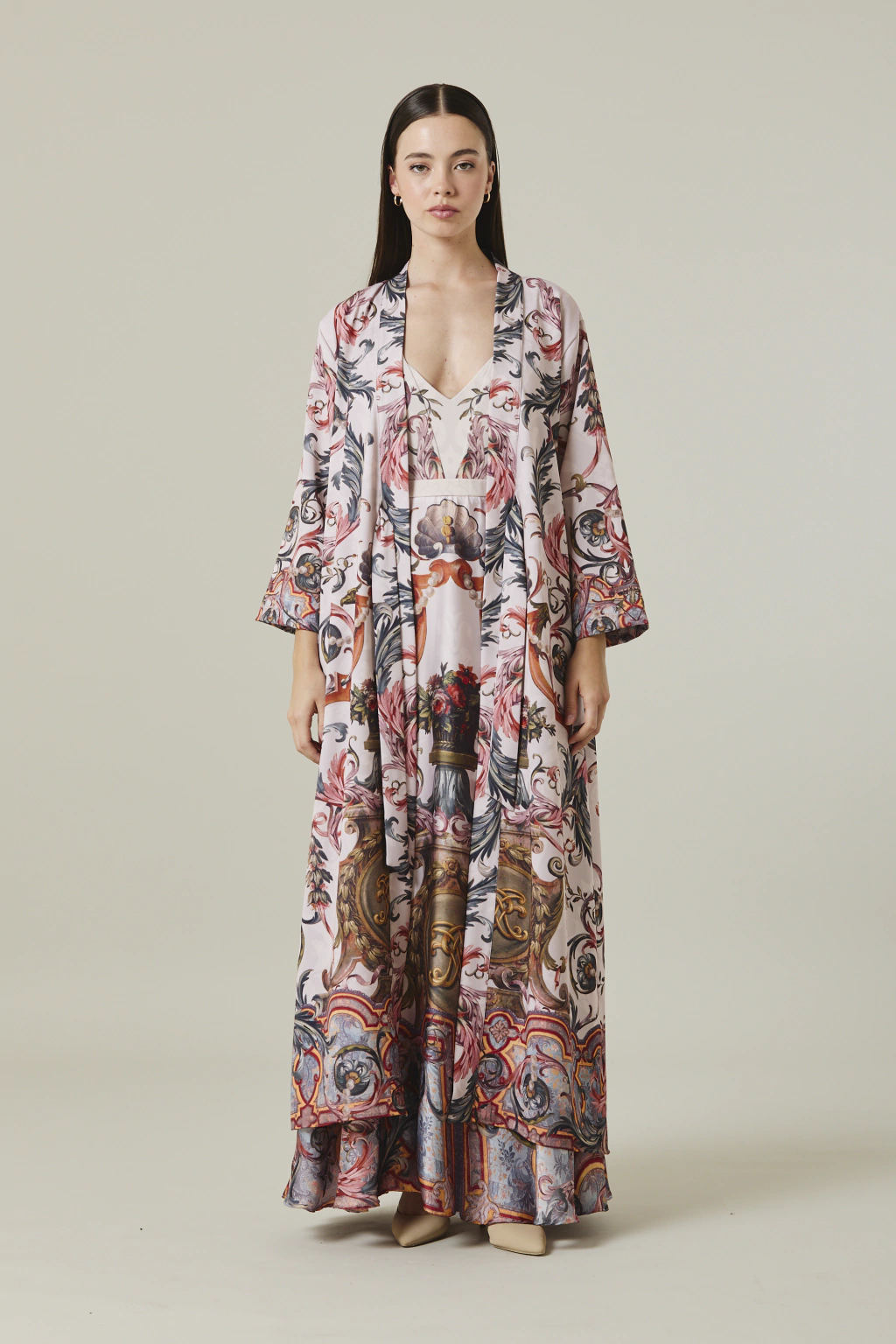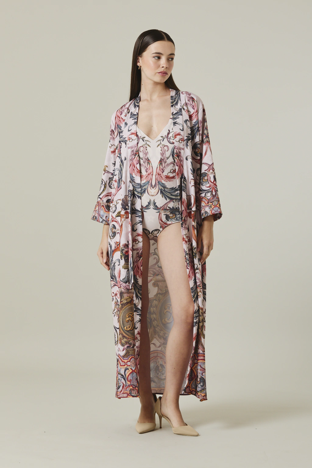 Este kimono, confeccionado en satén liviano con nuestra estampa exclusiva, es una prenda versátil y elegante que eleva cualquier outfit. Ideal para complementar tanto atuendos formales como looks diarios, su diseño único destaca por su estilo refinado y moderno.