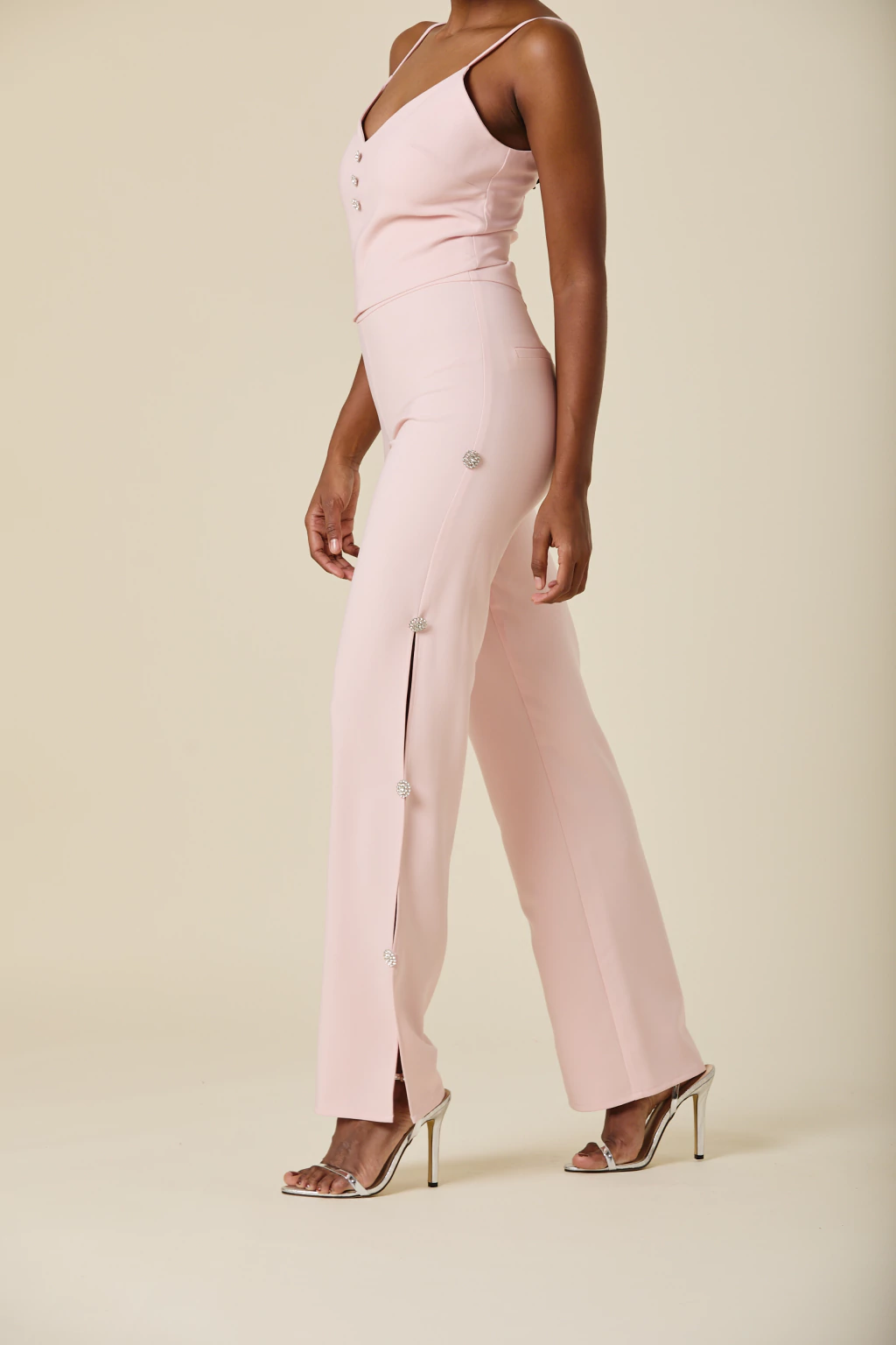Este pantalón de creppe sastrero combina elegancia y audacia en una prenda única. Los tajos laterales añaden un toque moderno y dinámico, mientras que los apliques metálicos con strass en la parte inferior aportan un brillo sutil pero impactante, elevando el diseño a otro nivel. El corte recto y la estructura impecable del creppe sastrero ofrecen comodidad y un ajuste favorecedor, ideal para quienes buscan un pantalón que combine sofisticación con un detalle de distinción.