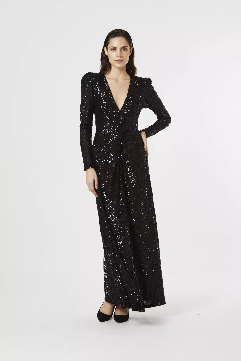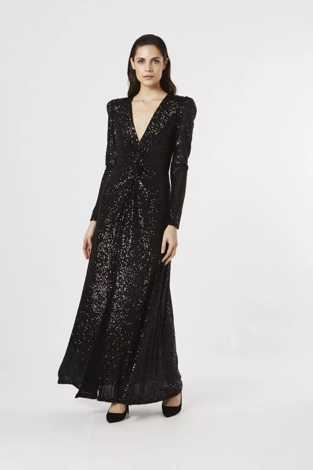Este vestido es una verdadera declaración de estilo, el diseño presenta un escote en V profundo añadiendo un toque de glamour al vestido.