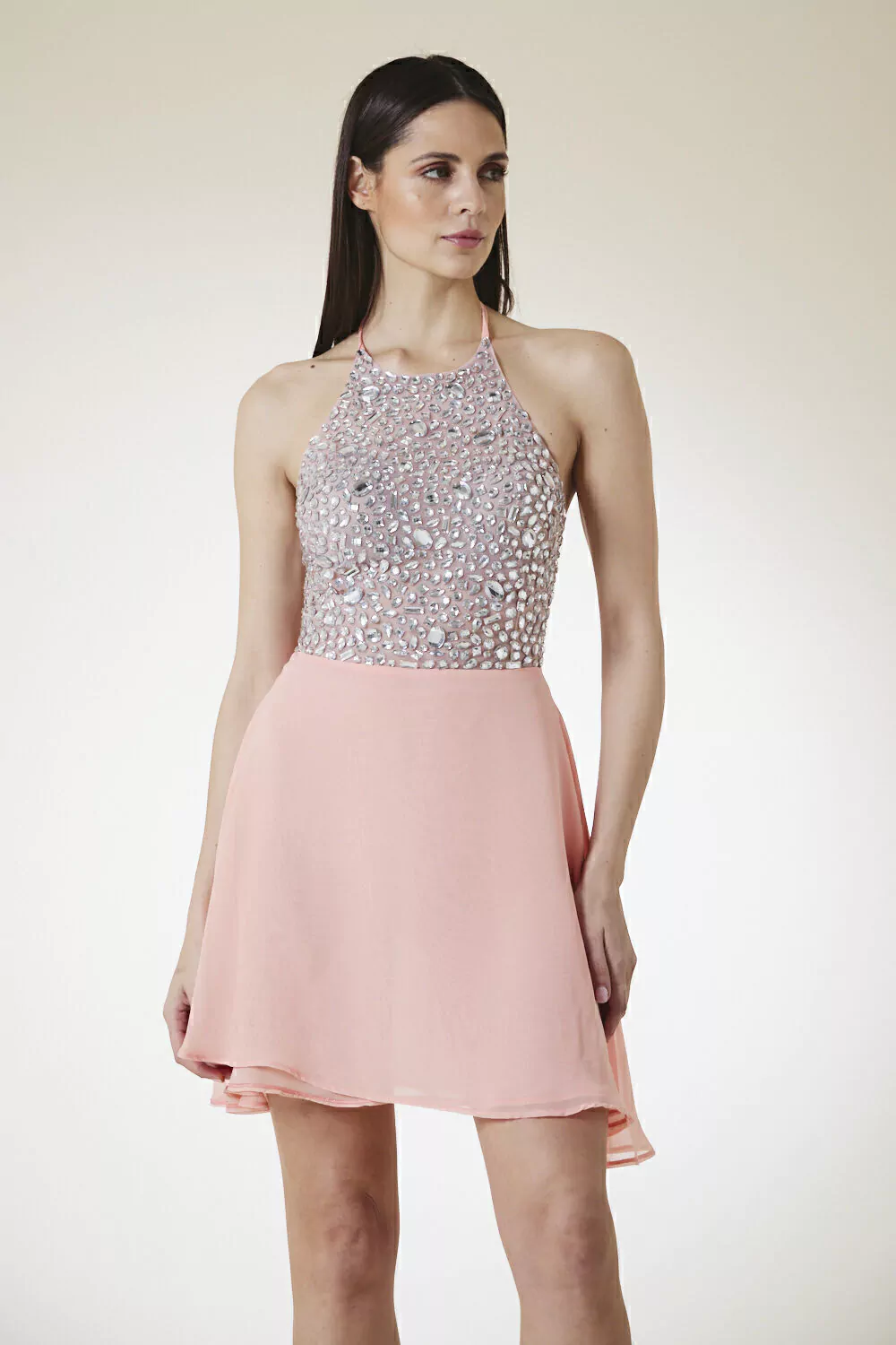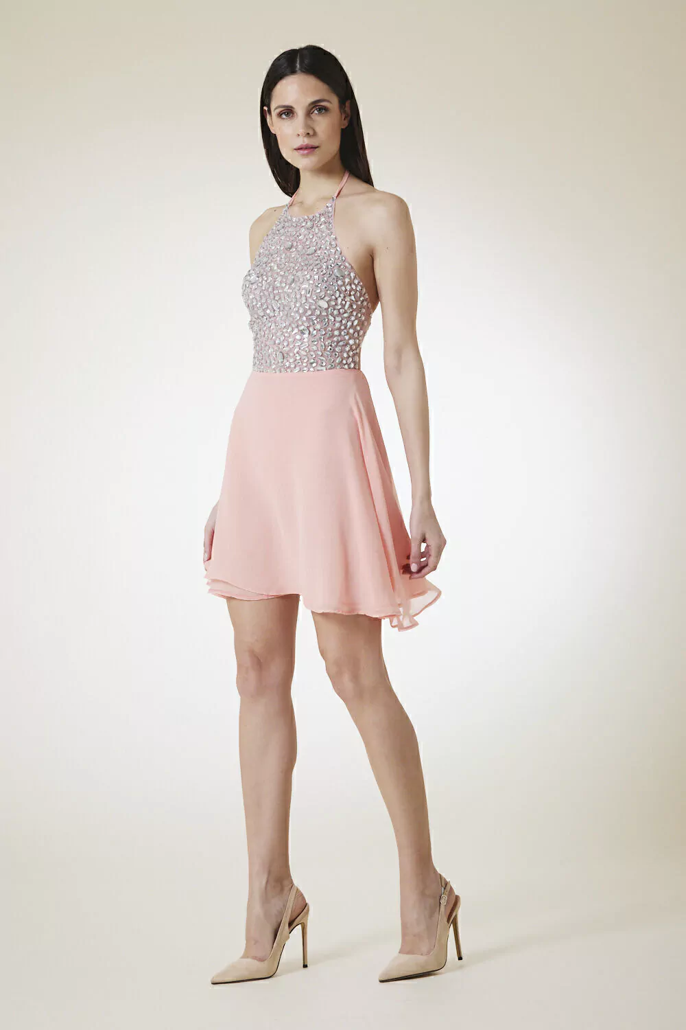 Este elegante vestido combina un torso bordado con piedras de cristal y una falda de gasa que aporta ligereza y movimiento. Ideal para ocasiones especiales.