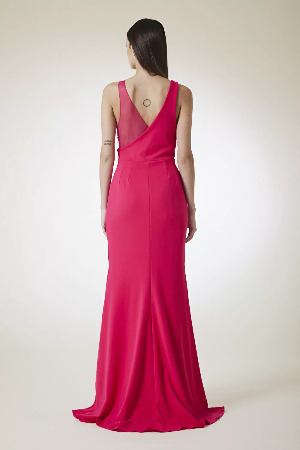 Vestido largo confeccionado en creppe elastizado, adornado con un exquisito bordado a mano de piedras de cristal. Este diseño elegante y detallado es ideal para destacar en cualquier lugar y momento.