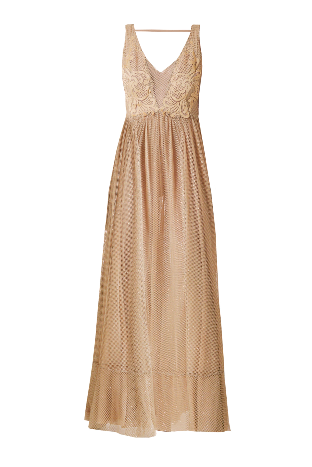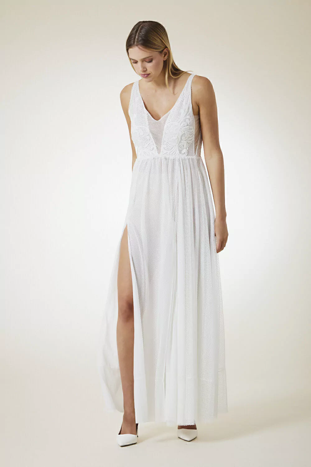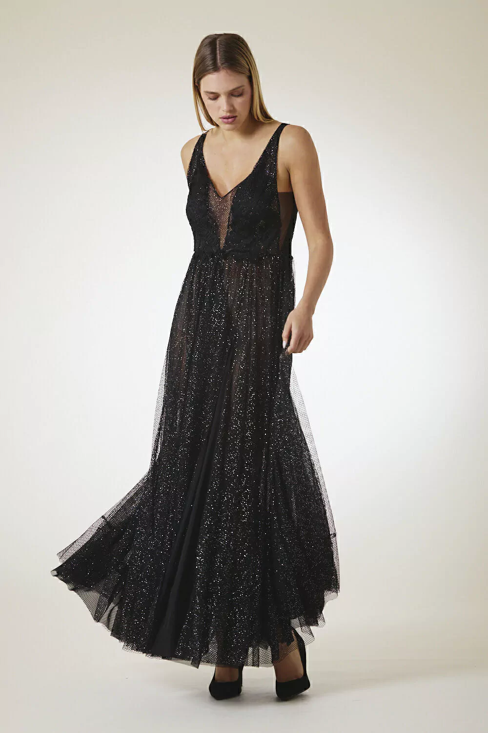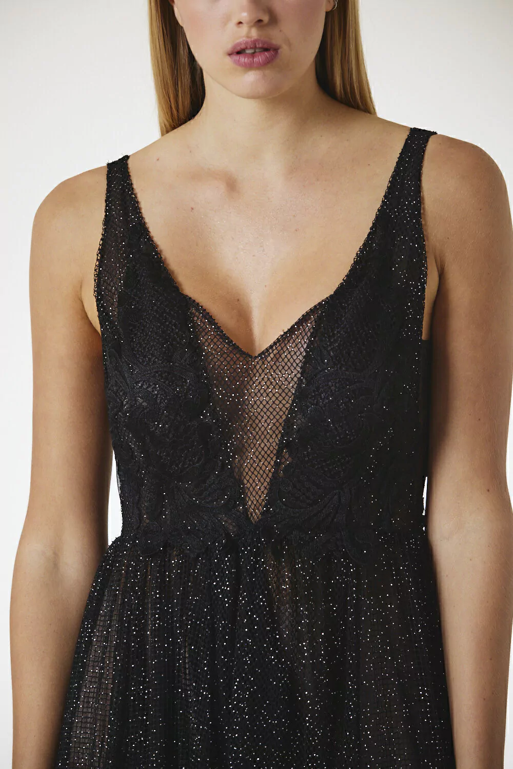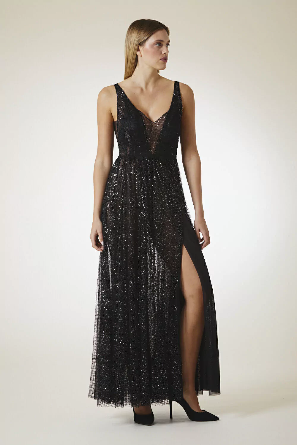 Vestido largo de red con lurex, diseñado para deslumbrar. Presenta un torso con escote profundo y una falda con frunce y tajos delanteros que aportan movimiento y sensualidad. Esta prenda es perfecta para quienes buscan destacar con un look audaz y sofisticado.