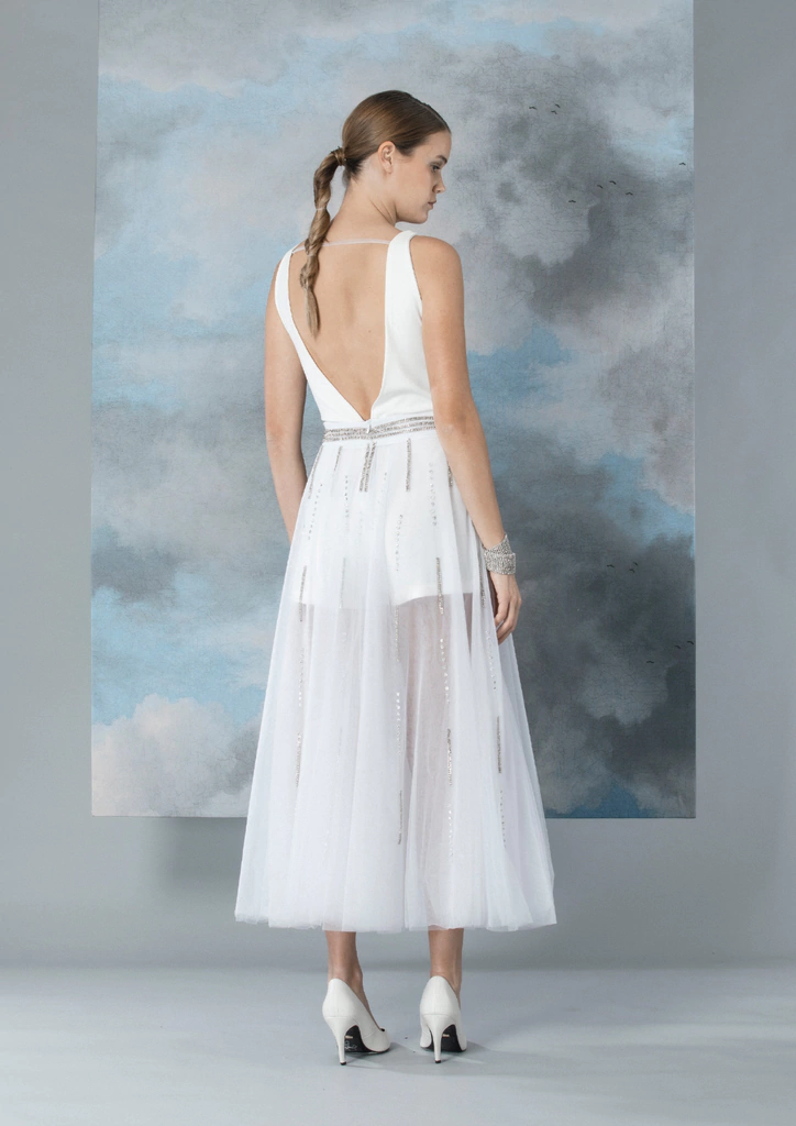 Deslumbra con nuestra elegante falda midi de tul en tres capas, cuidadosamente confeccionada con un bordado lineal intercalado de cristales y deslumbrantes cadenas de strass. Añade un toque de lujo a tu guardarropa con esta prenda única y deslumbrante
