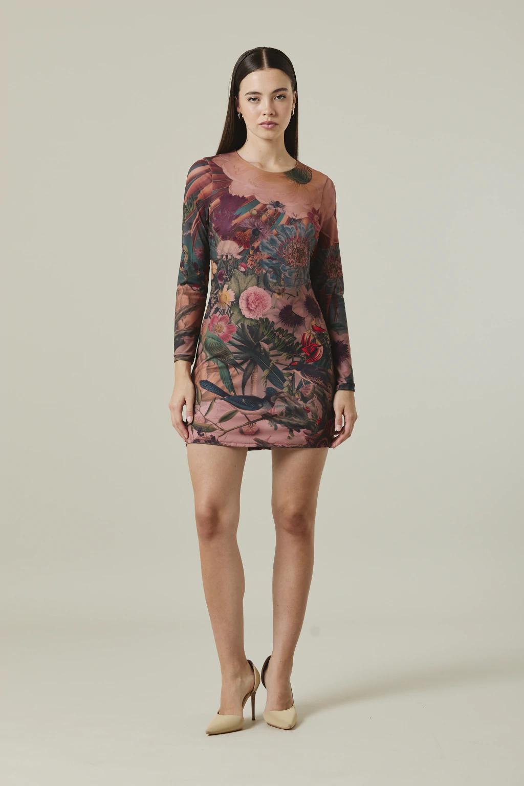Vestido Corto de Jersey Elastizado, una prenda que fusiona comodidad y estilo con una estampa exclusiva de flores.