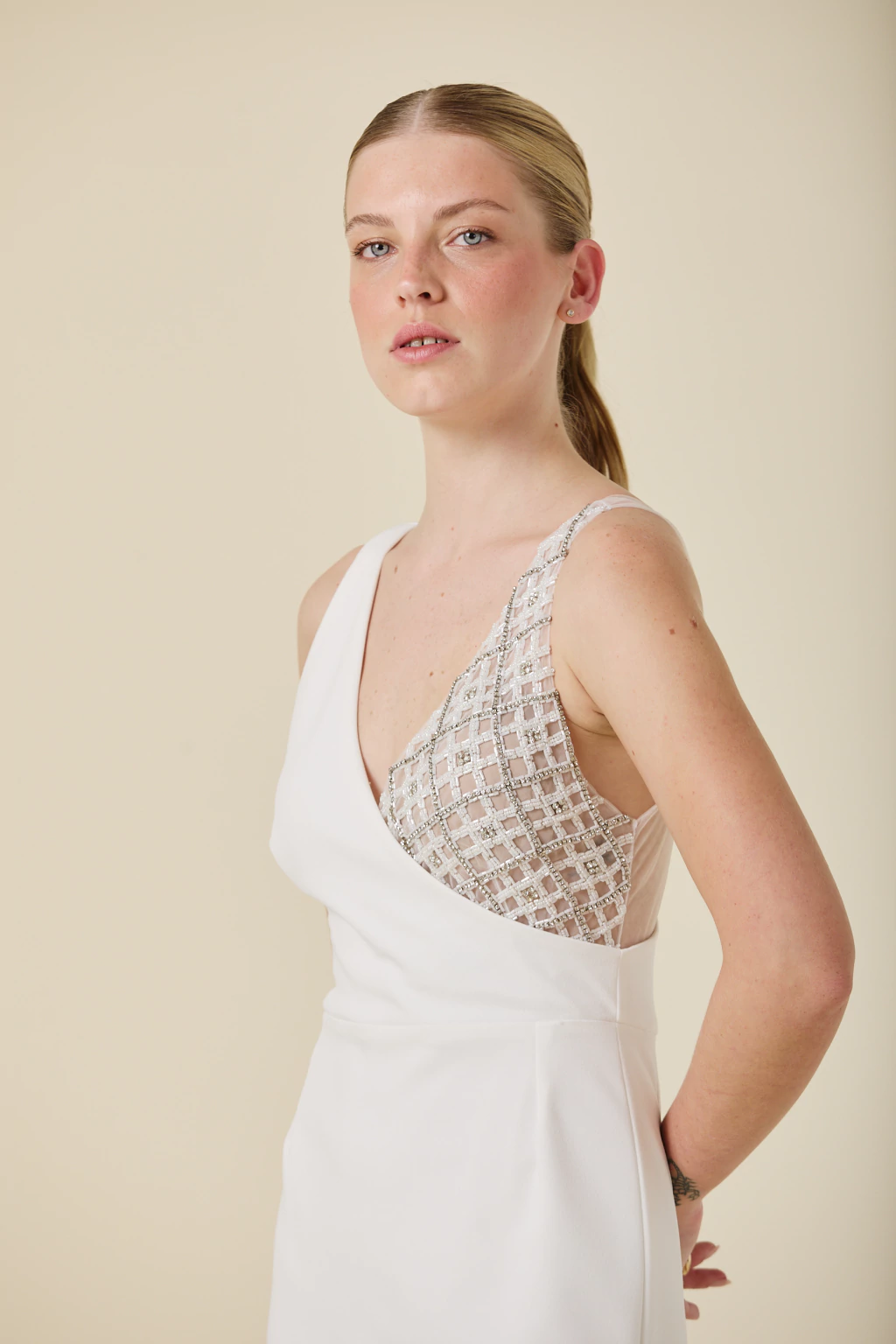 Este vestido largo de crepe elastizado combina elegancia y detalles sofisticados. El recorte de tul bordado añade un toque de delicadeza y realce al diseño, resaltando la silueta con un contraste sutil y refinado.