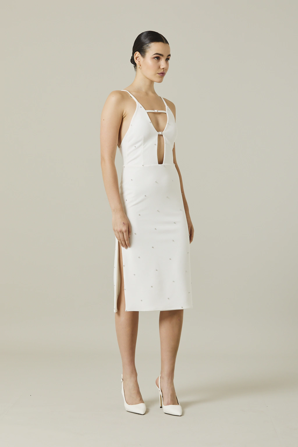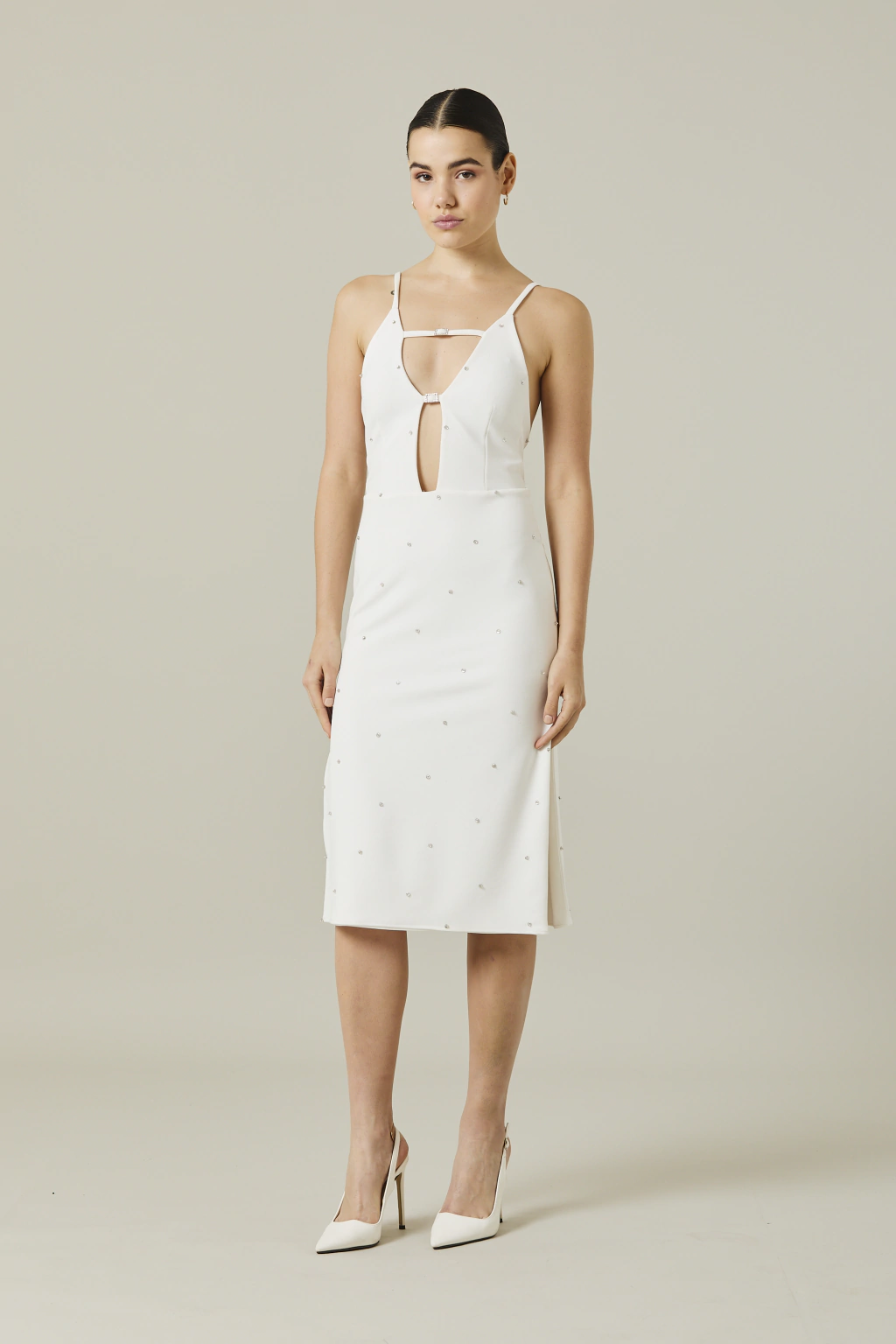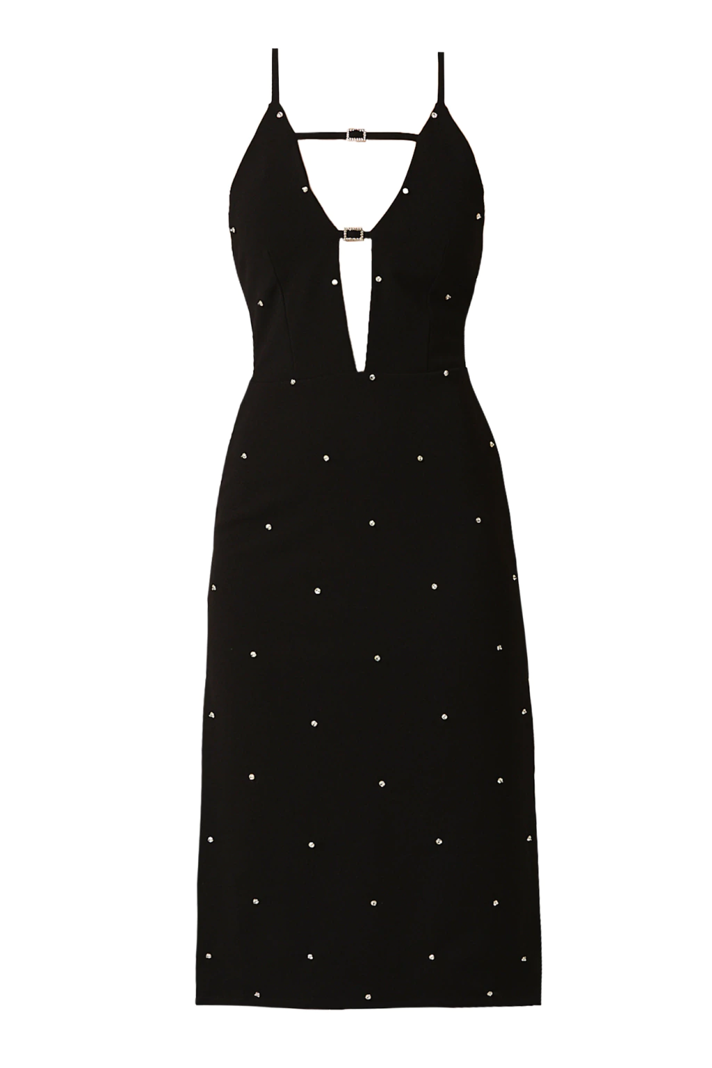 Este elegante vestido largo midi de creppe elastizado combina un ajuste favorecedor con detalles deslumbrantes. Las presillas de strass en el escote añaden un toque brillante y sofisticado, mientras que la tela de creppe elastizado garantiza comodidad y movimiento. Perfecto para una ocasión especial en la que quieras destacar con sutileza y glamour.