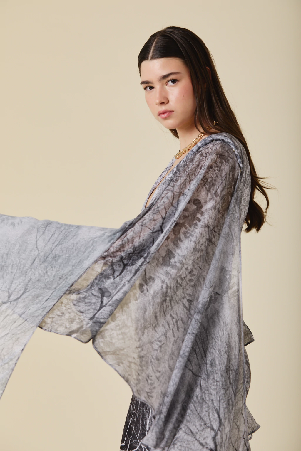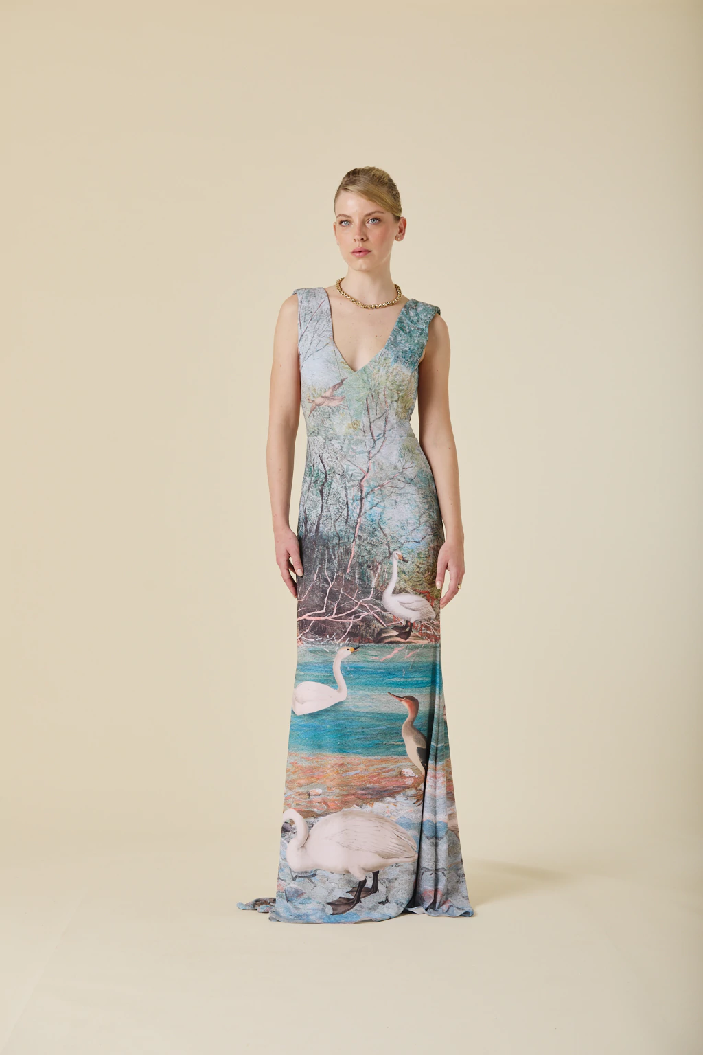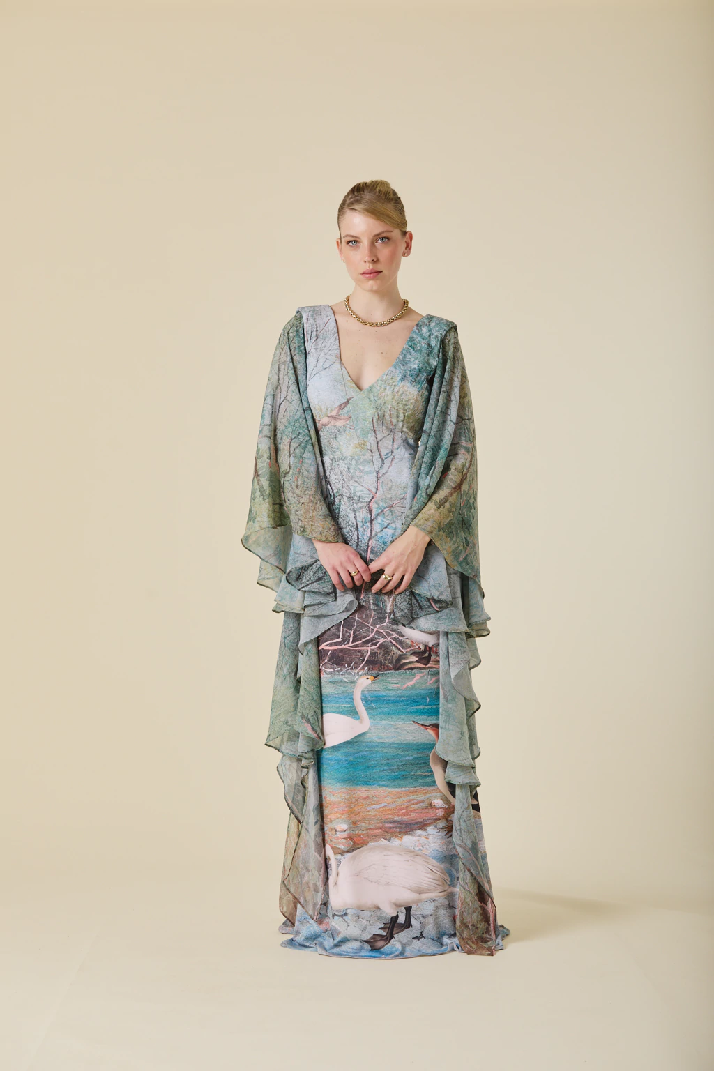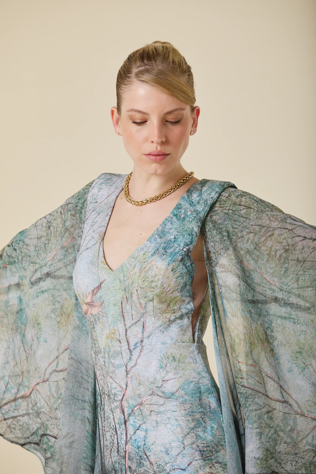 Destaca con elegancia en cualquier evento esta prenda única cuenta con mangas de gasa desmontables que aportan distinción y sofisticación a tu look. La estampa exclusiva y la cola añaden un toque especial, convirtiendo este vestido en una opción inolvidable para cualquier ocasión.
