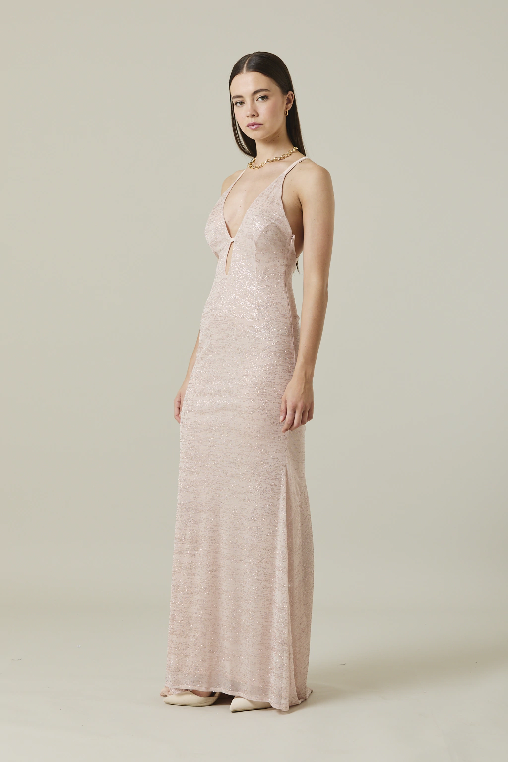Este deslumbrante vestido largo de tul lycra con gliter está diseñado para brillar en cualquier ocasión. La espalada con recorte y el delantero con una delicada gota aportan un toque de sensualidad y elegancia. Su tela con gliter refleja la luz de manera sutil, creando un efecto espectacular en movimiento.