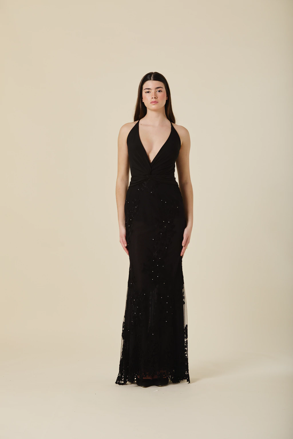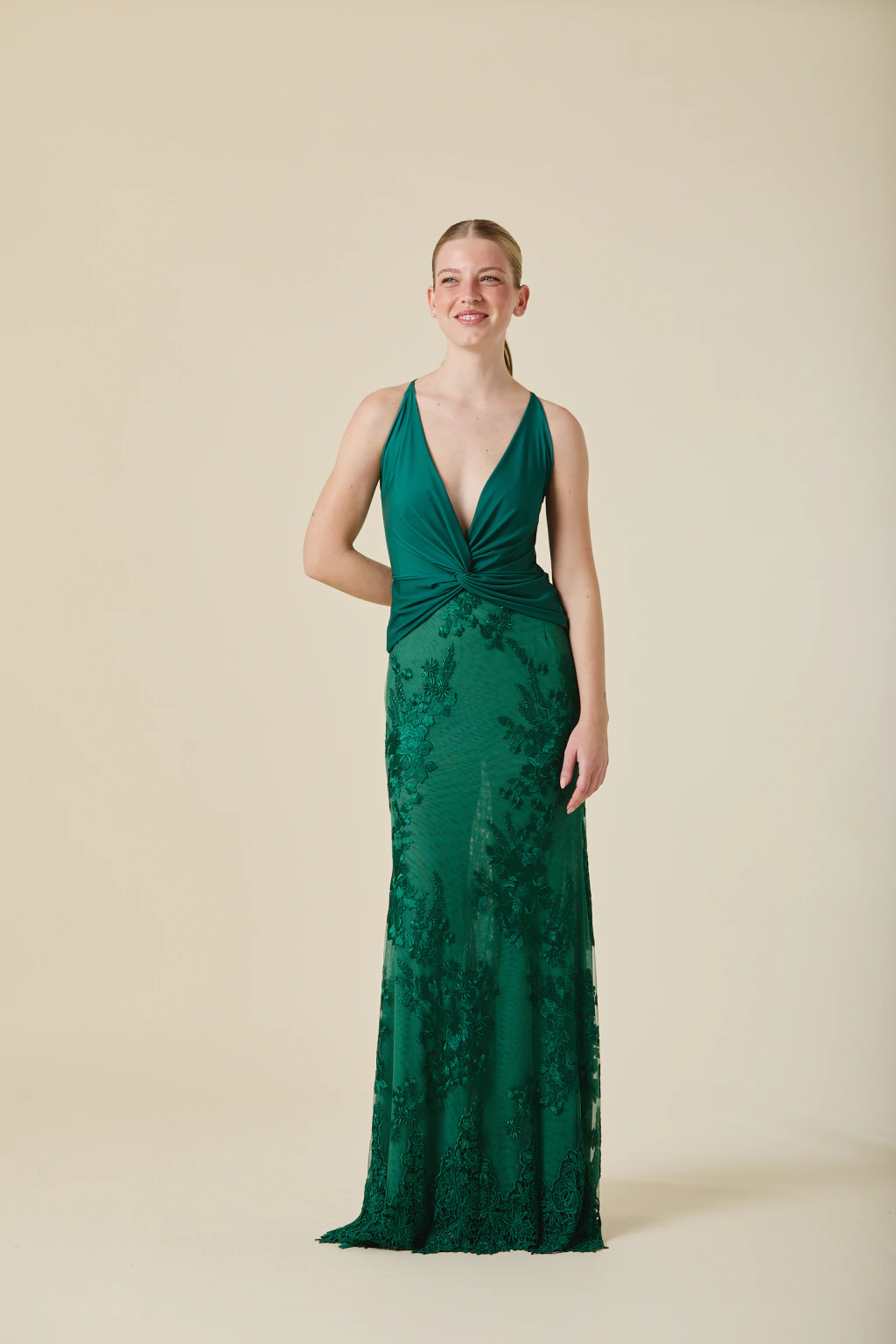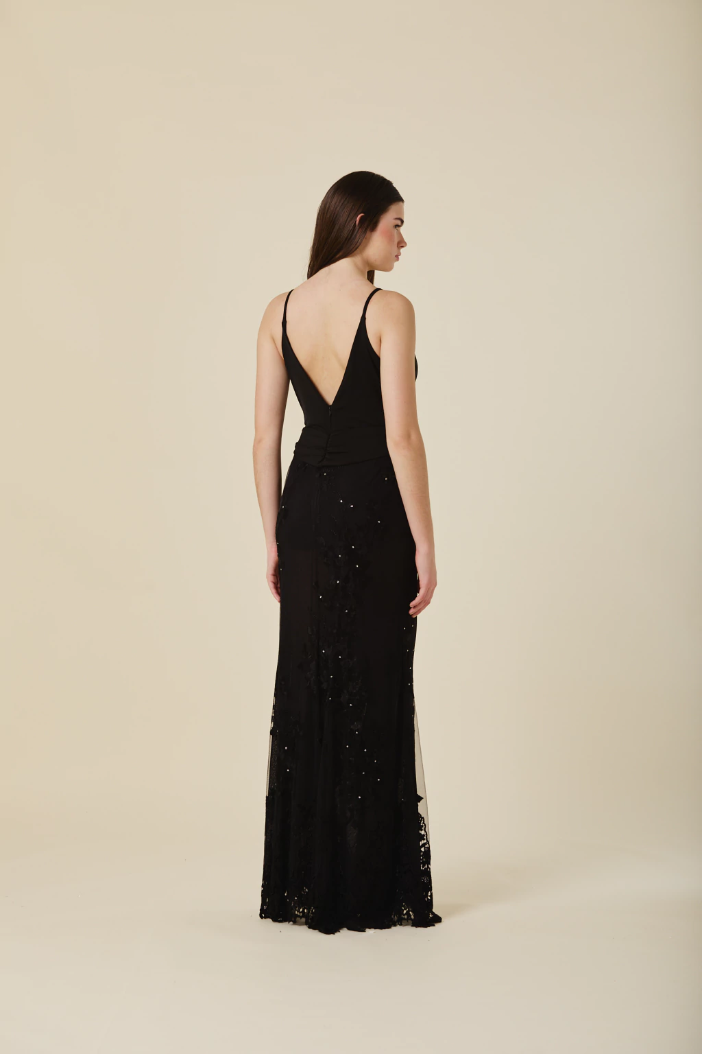 Este vestido largo combina un torso de crepe elastizado con una falda de tul bordado, logrando un equilibrio perfecto entre estructura y fluidez. Su escote en V profundo y breteles delgados realzan la figura con sutileza, mientras que la falda semitransparente con bordados florales en relieve aporta un aire etéreo y sofisticado.