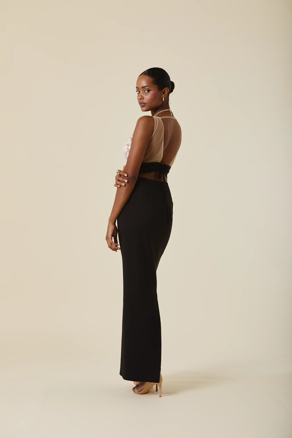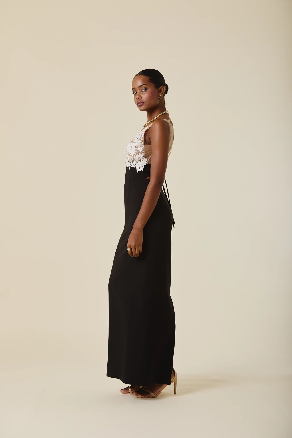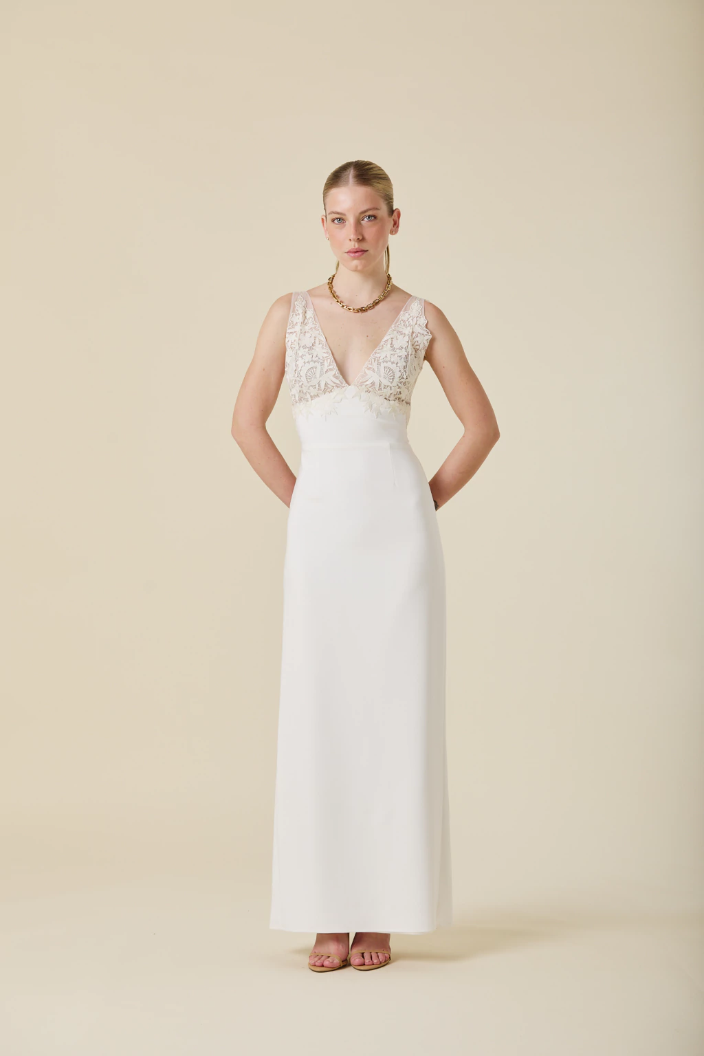 Este vestido largo combina delicadeza y sensualidad con su falda de caída fluida y tajo trasero, que aporta movimiento a cada paso. Su escote en tul bordado añade un detalle artesanal exclusivo, realzando su elegancia y sofisticación.