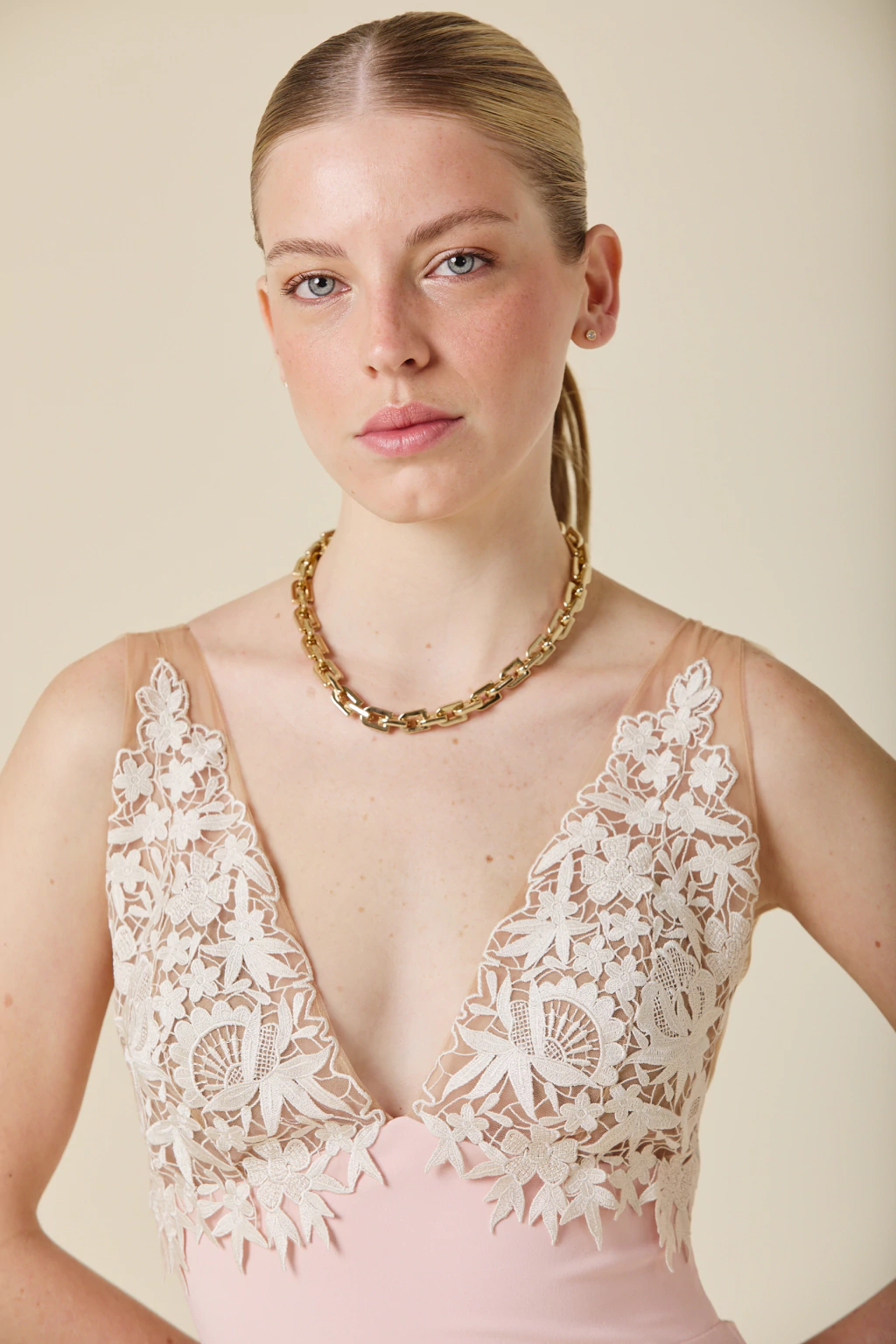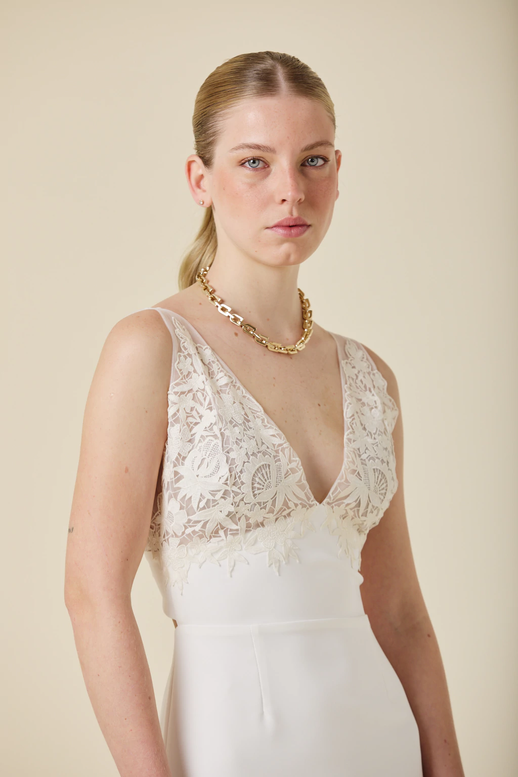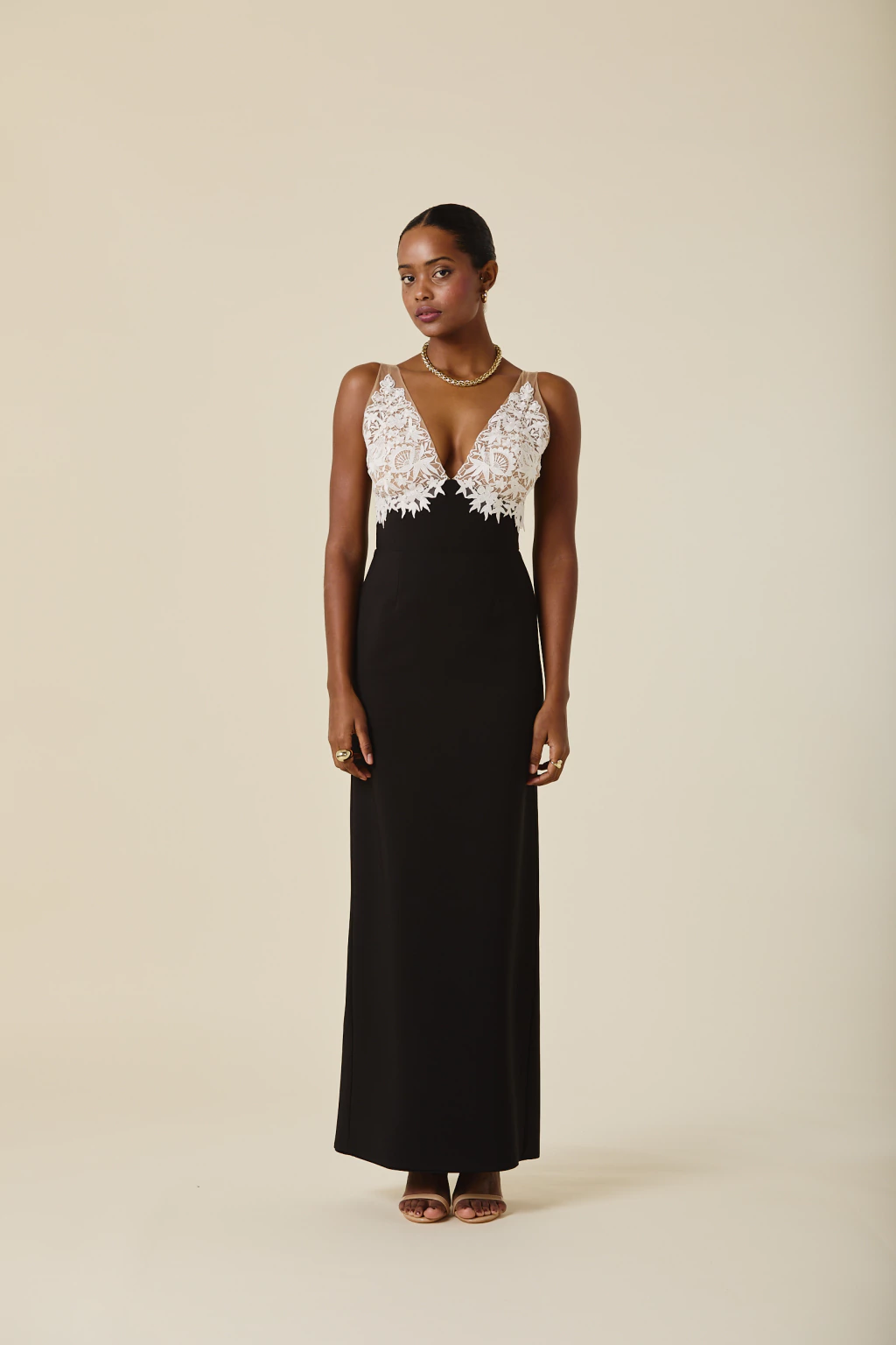 Este vestido largo combina delicadeza y sensualidad con su falda de caída fluida y tajo trasero, que aporta movimiento a cada paso. Su escote en tul bordado añade un detalle artesanal exclusivo, realzando su elegancia y sofisticación.