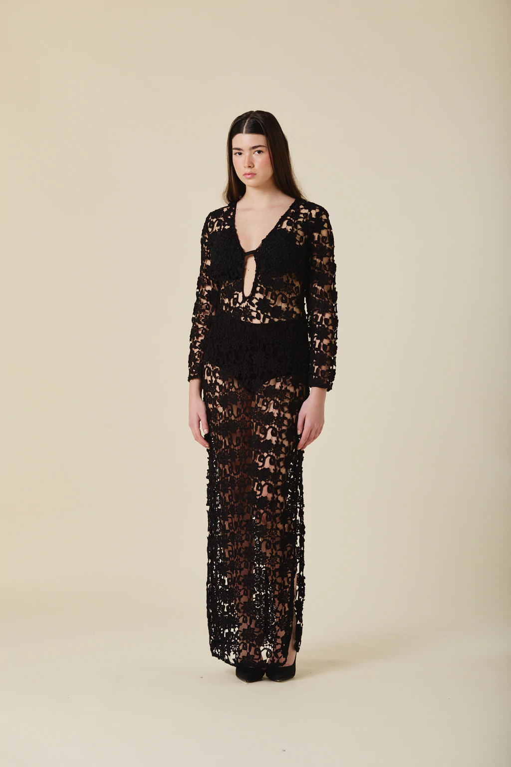 Este vestido largo de guipure con mangas largas y escote profundo es una pieza que combina sensualidad y sofisticación. El escote pronunciado resalta de manera elegante, mientras que el pasador de strass en el delantero aporta un toque brillante y distinguido, capturando la luz con cada movimiento. Las mangas largas complementan el diseño, ofreciendo una sensación de refinamiento y estilo clásico. La textura del guipure le otorga un aire romántico y delicado, mientras que su corte fluido asegura comodidad y elegancia en todo momento.