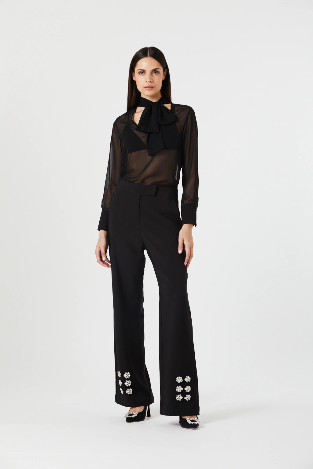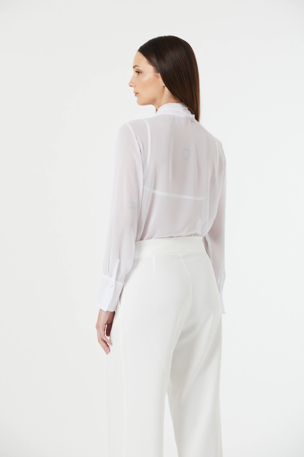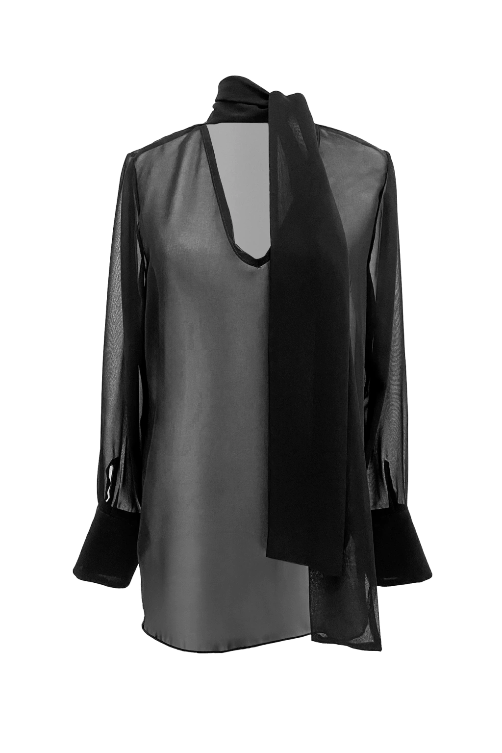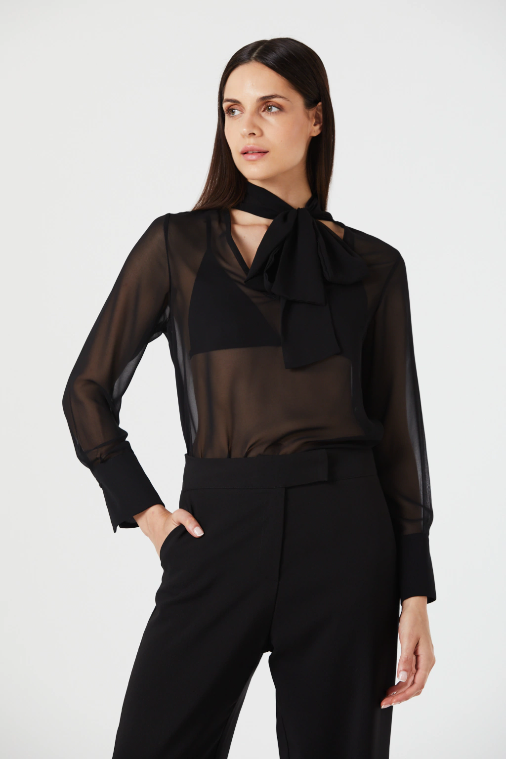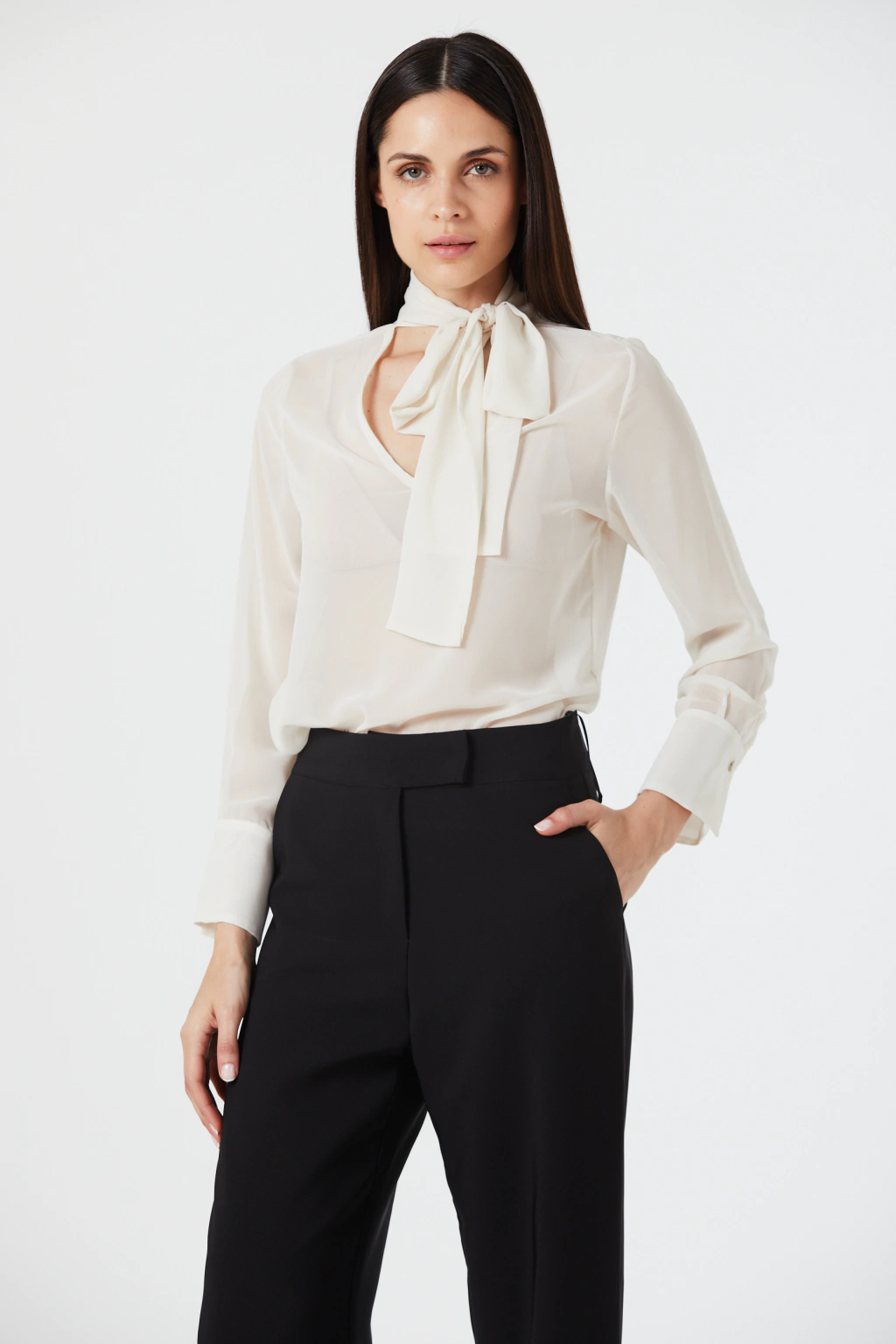 Blusa Lavinia de gasa con manga larga y detalle de lazo en el cuello, La manga larga agrega un toque de sofisticación, mientras que el lazo en el cuello aporta un toque femenino y distintivo. Perfecta para ocasiones formales o para elevar tu estilo diario con un toque de encanto