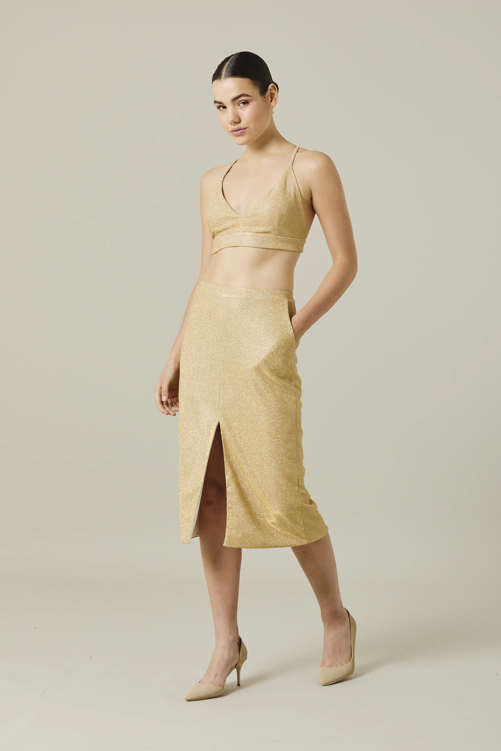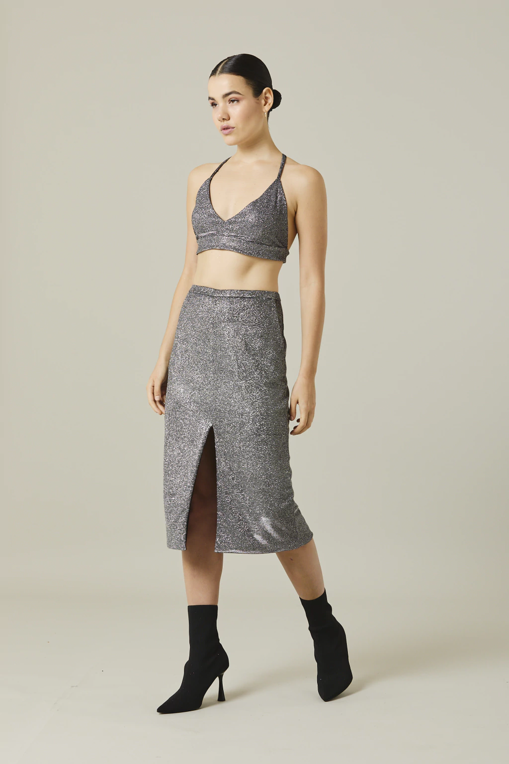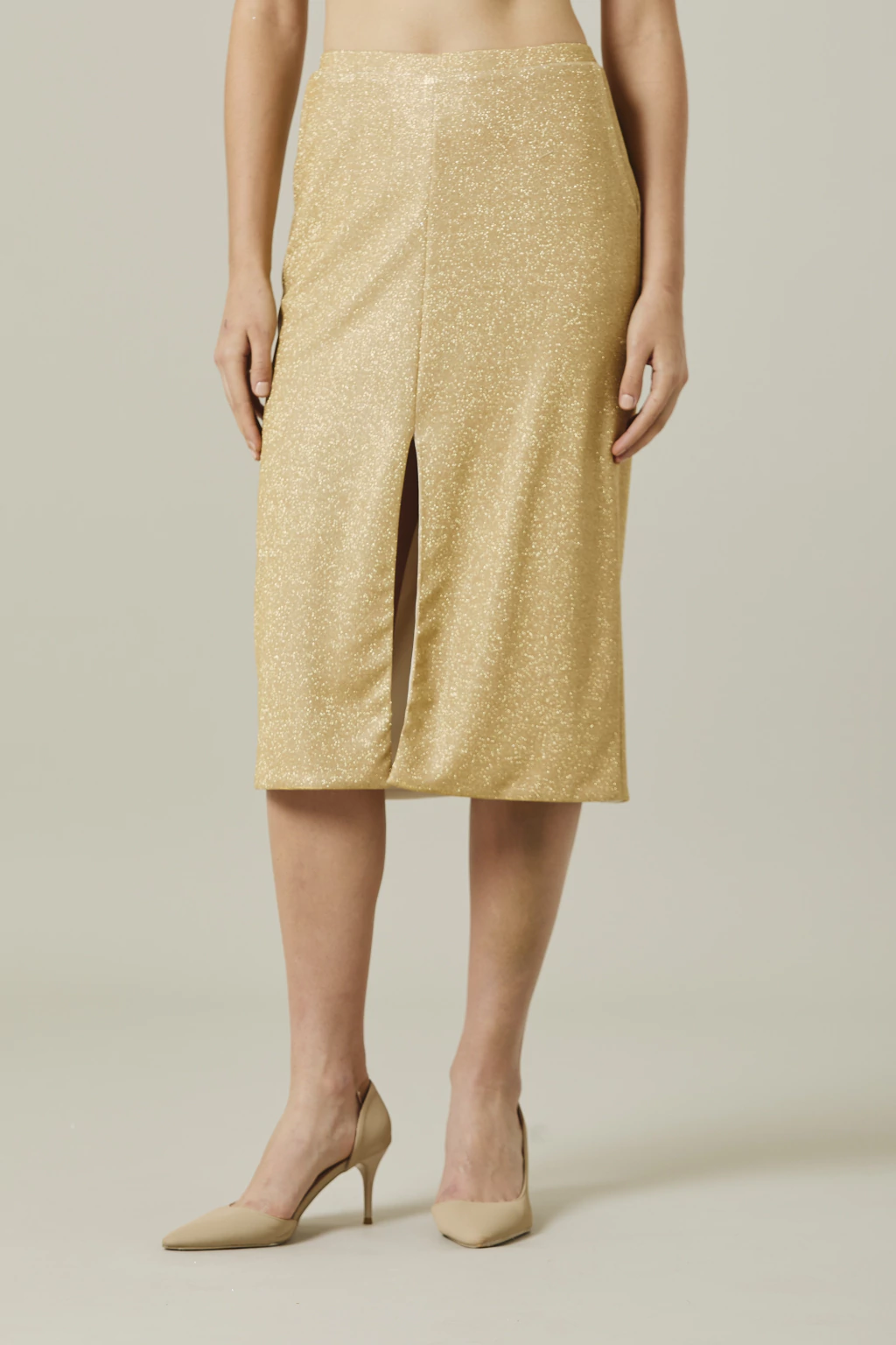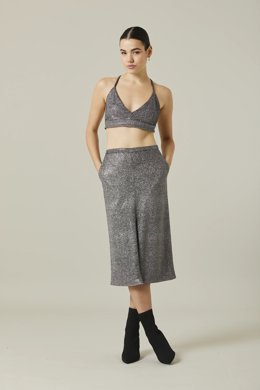 Esta falda midi de creppe elastizado con glitter es la combinación perfecta de elegancia y comodidad. Su corte recto con tajo en el delantero le otorga un toque moderno y dinámico, mientras que los bolsillos funcionales añaden un detalle práctico sin sacrificar el estilo.