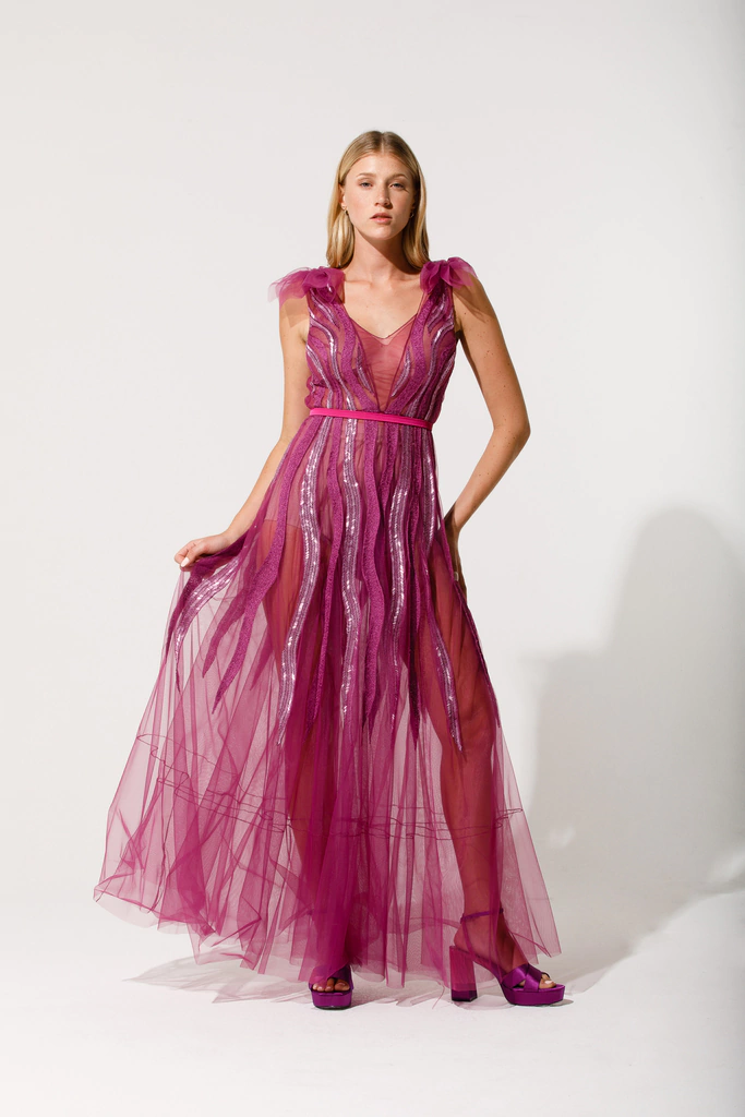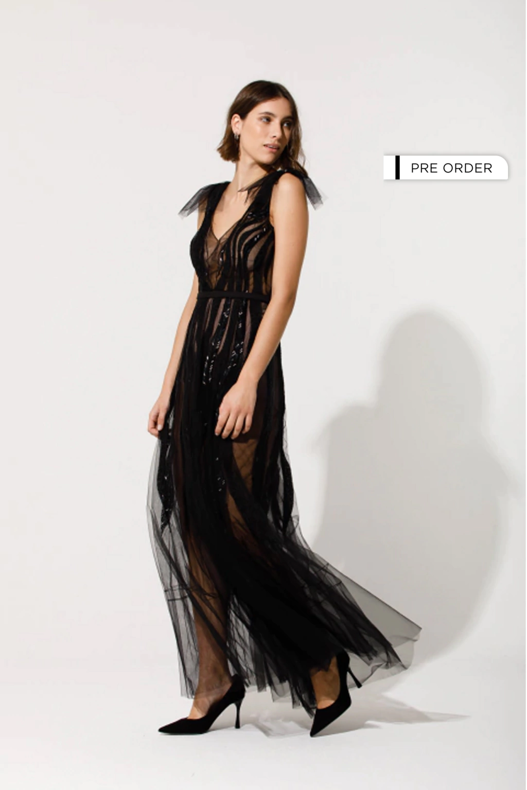 Reintroduciendo el icónico Vestido Eira, que conserva su sensualidad característica, confeccionado en tul delicado, su textura ligera aporta una sensación de movimiento y gracia a cada paso.