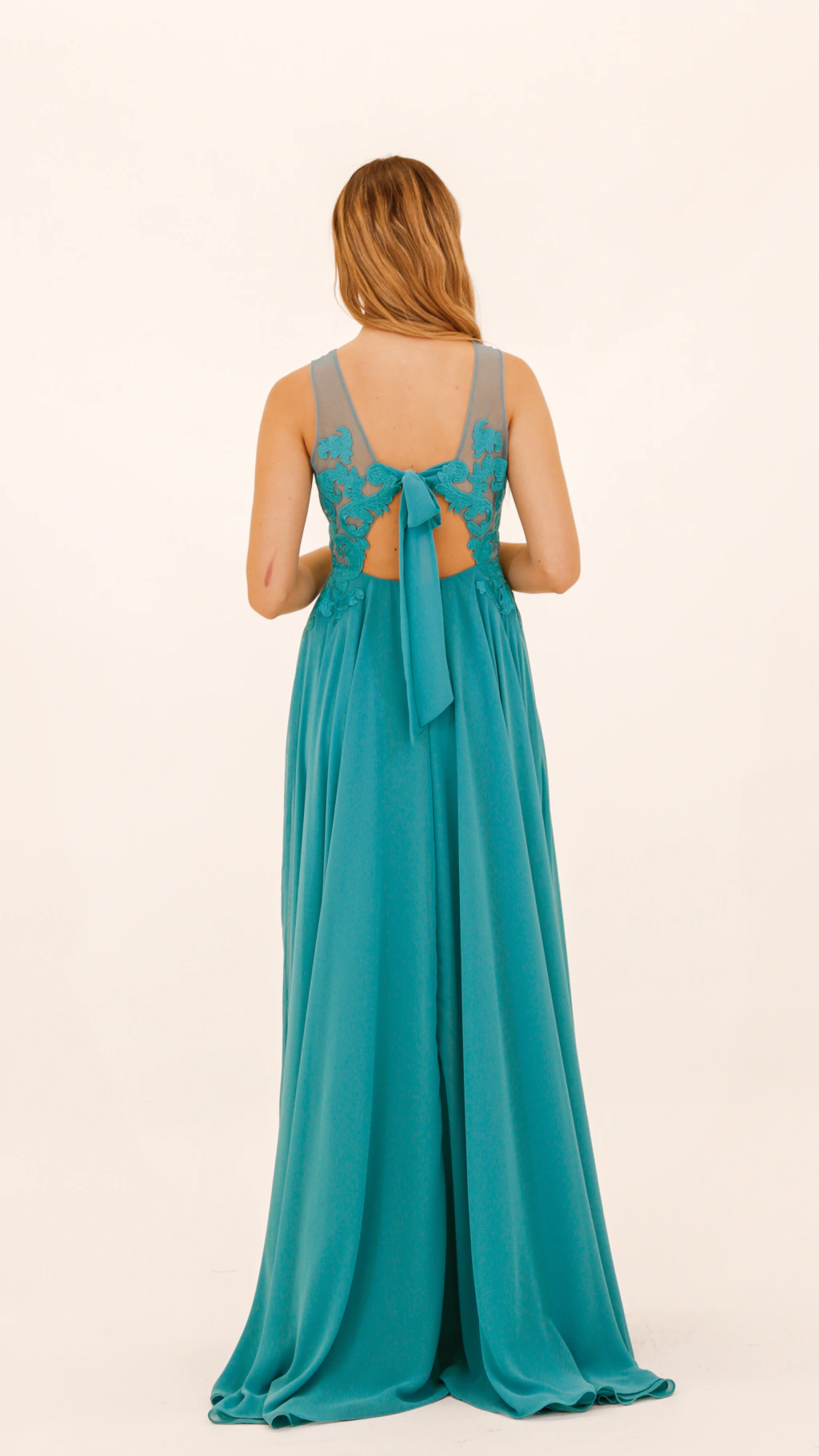 Vestido de tul con falda de gasa y bordado de búlgaros en la pechera. Una opción encantadora y elegante para lucir en eventos especiales.