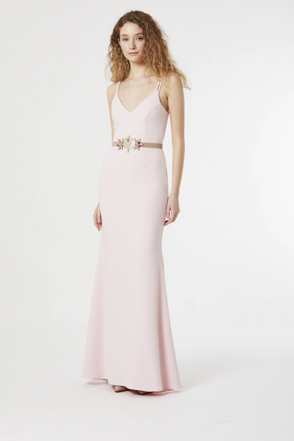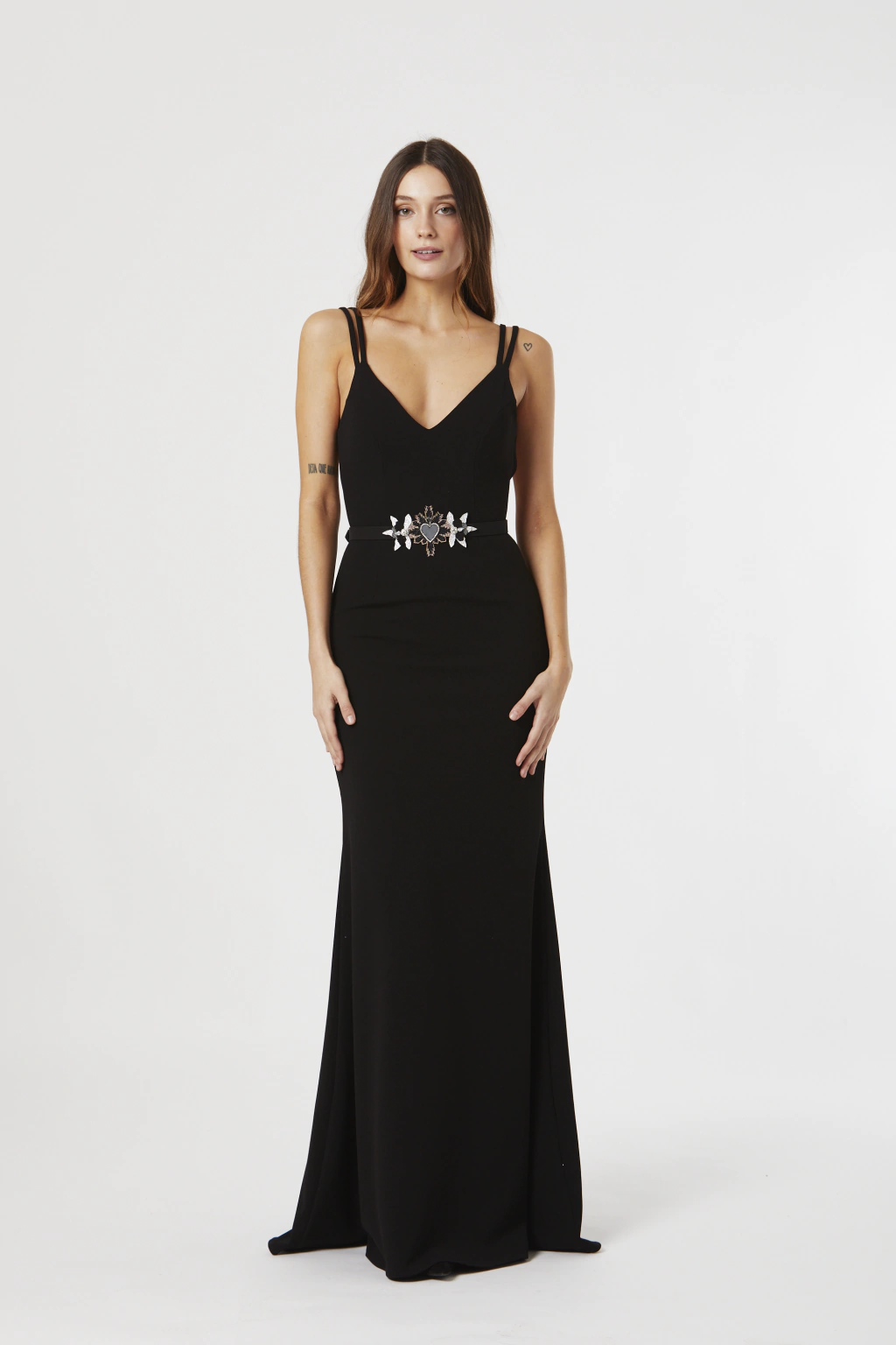 Vestido largo de creppe elastizado con breteles y falda sirena es una elección perfecta para eventos especiales que requieren un toque de elegancia y sensualidad.