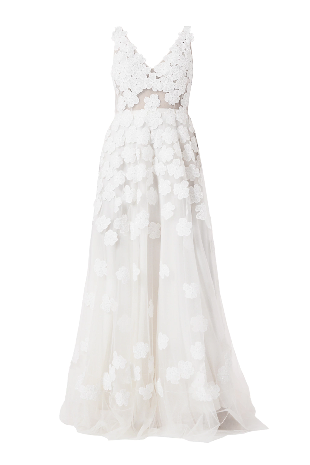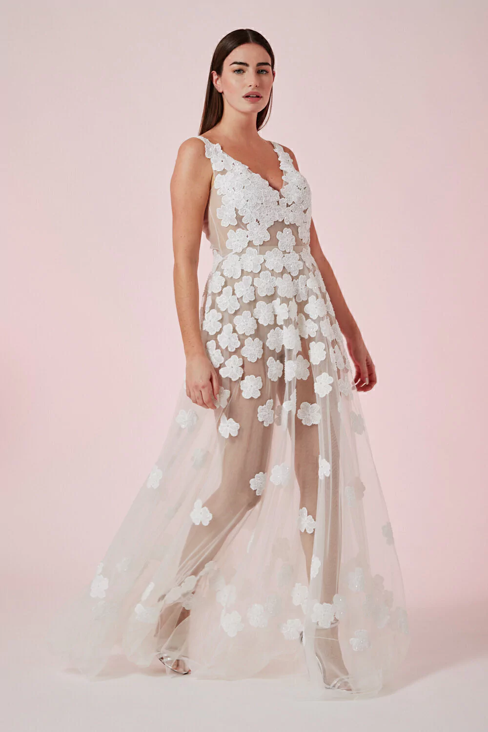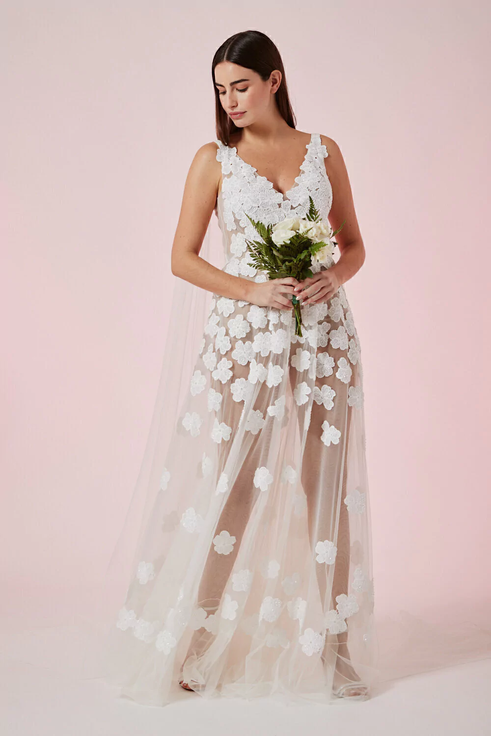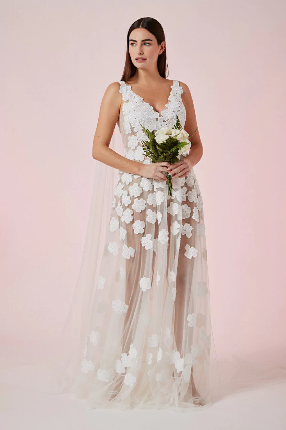 Vestido largo de tul con Bordado de Flores. Este diseño destaca por sus delicadas flores bordadas en degradé, creando un efecto visual único y encantador. El escote en V aporta un toque de elegancia, mientras que la falda amplia de encaje añade un aire romántico y sofisticado.