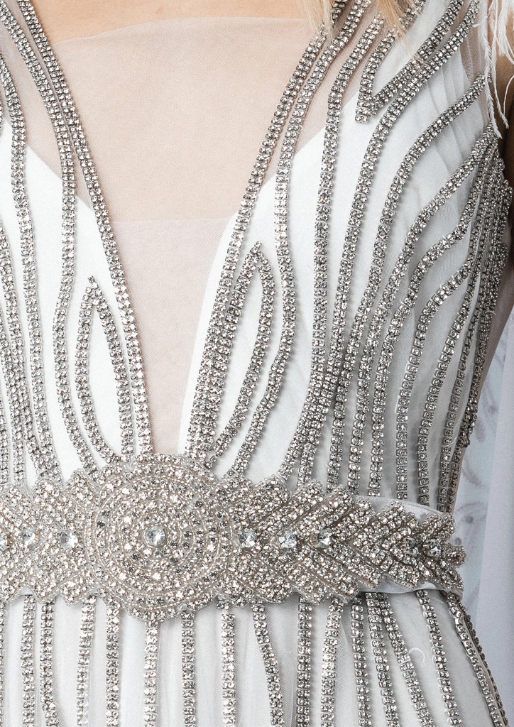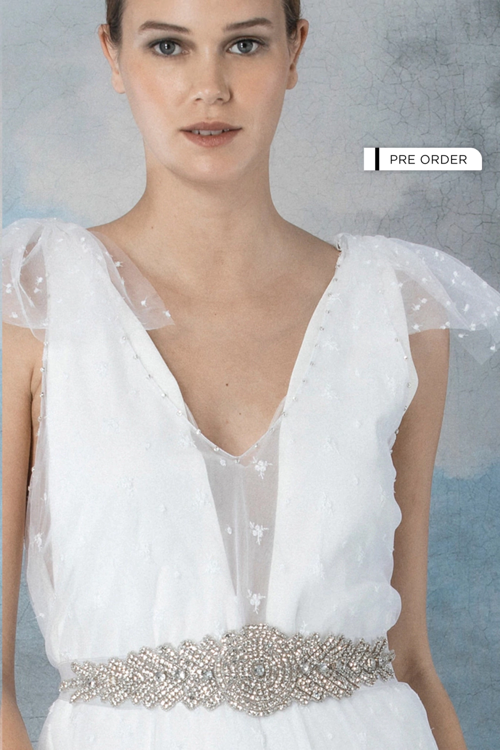 Cinto de raso con aplique simétrico hecho en strass y mostacillas.