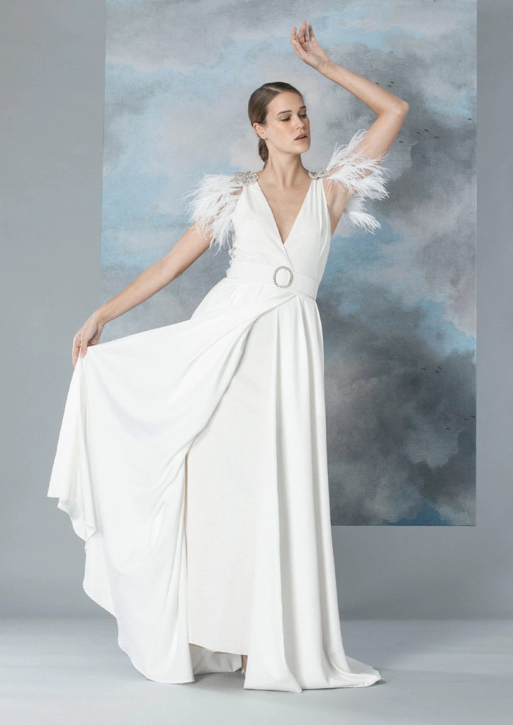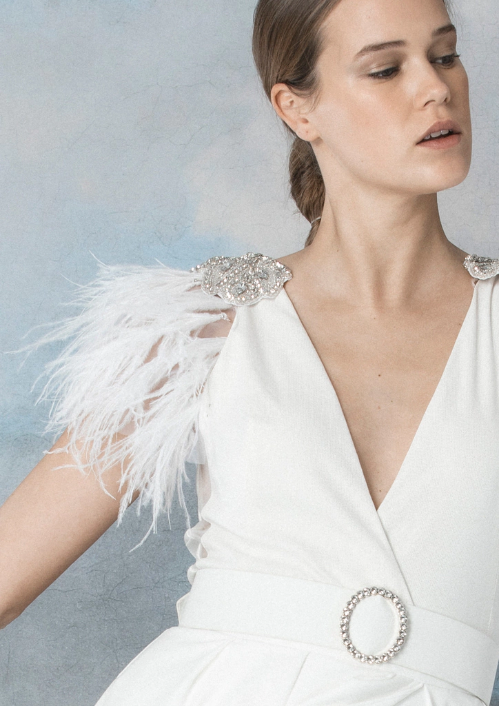 Par de mangas cortas de tul con bordado de plumas y cristales salpicados.
