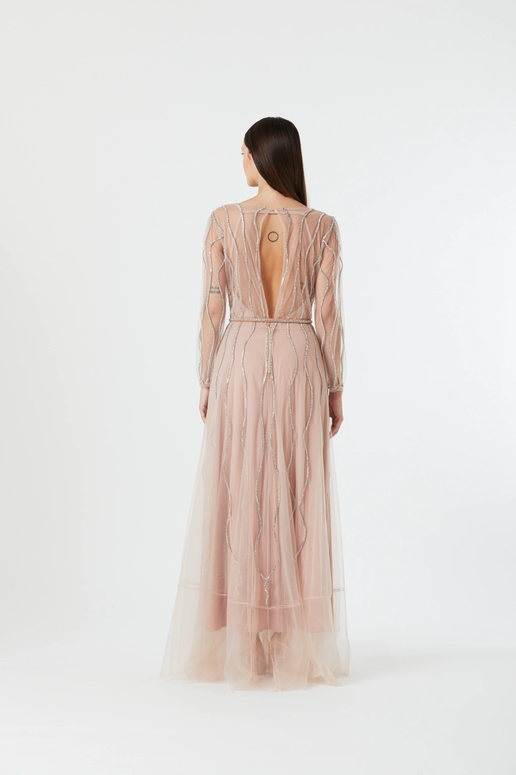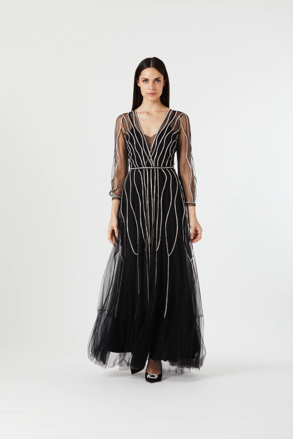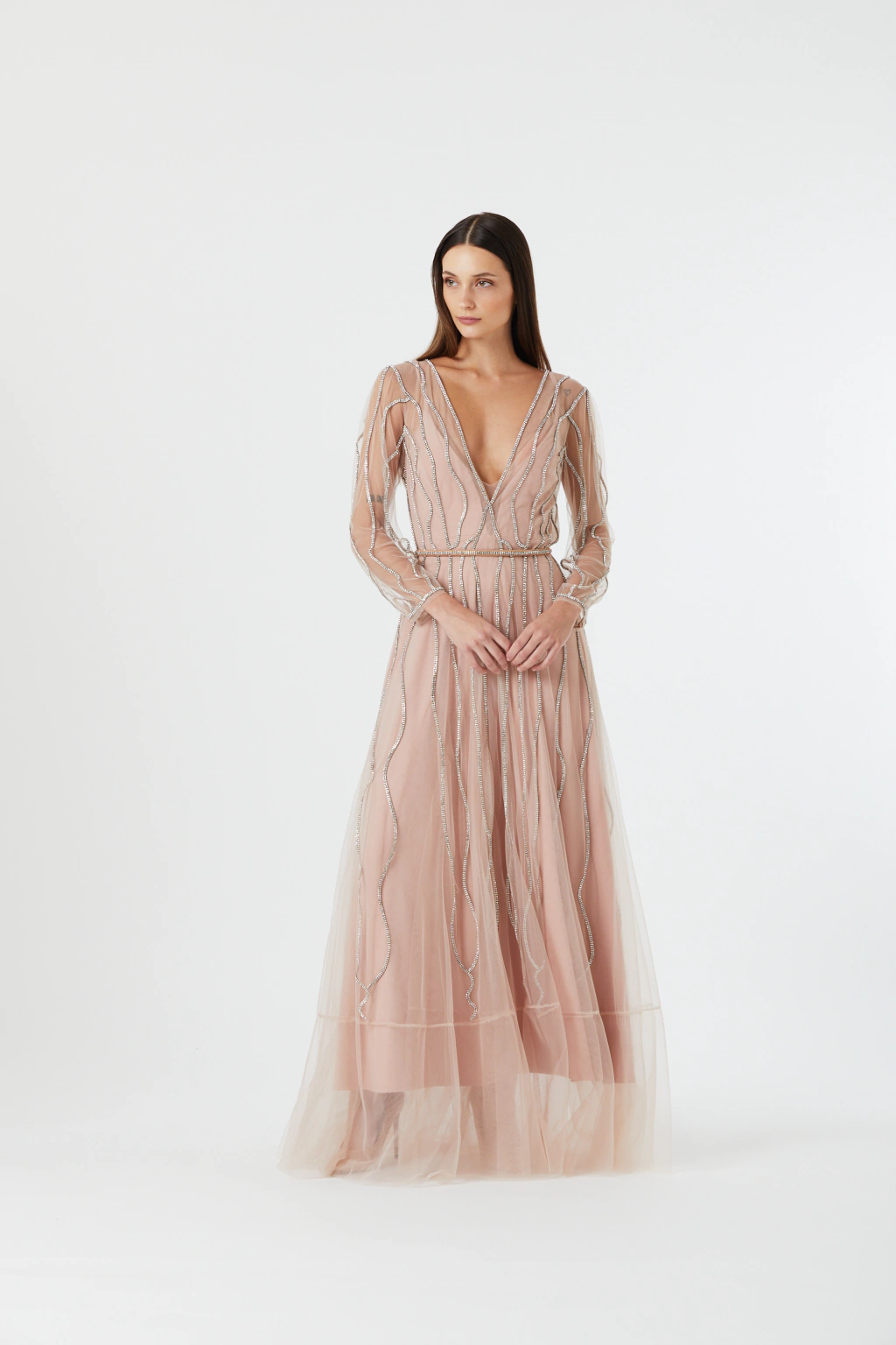 Vestido largo de tul que combina elegancia y sensualidad a la perfección. Las mangas largas y el escote en "V" añaden un toque de sofisticación, mientras que la falda medio plato proporciona un movimiento fluido. El bordado orgánico con cadenas de strass doble aporta brillo y detalles únicos.