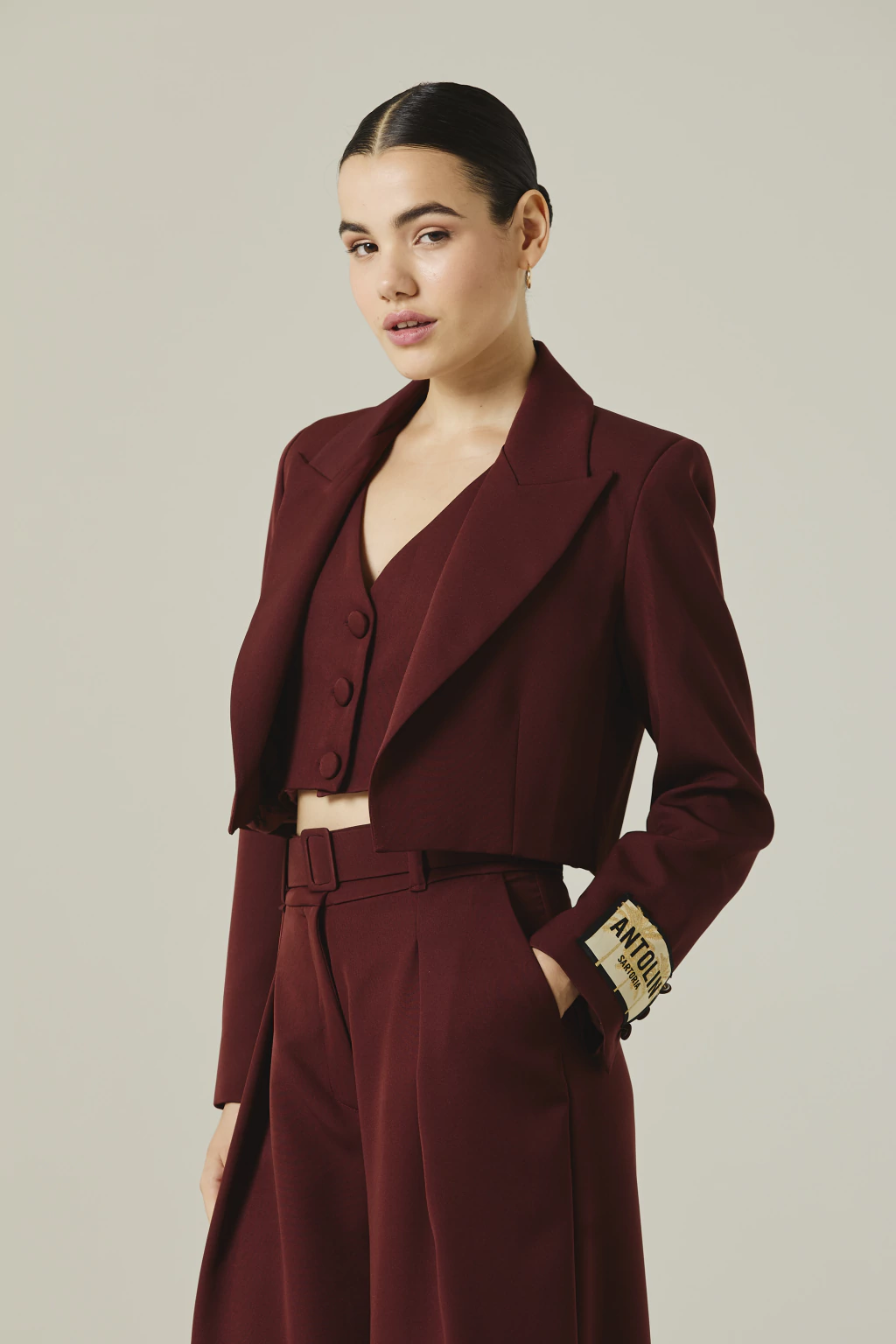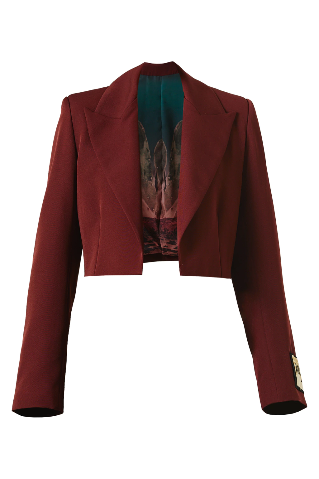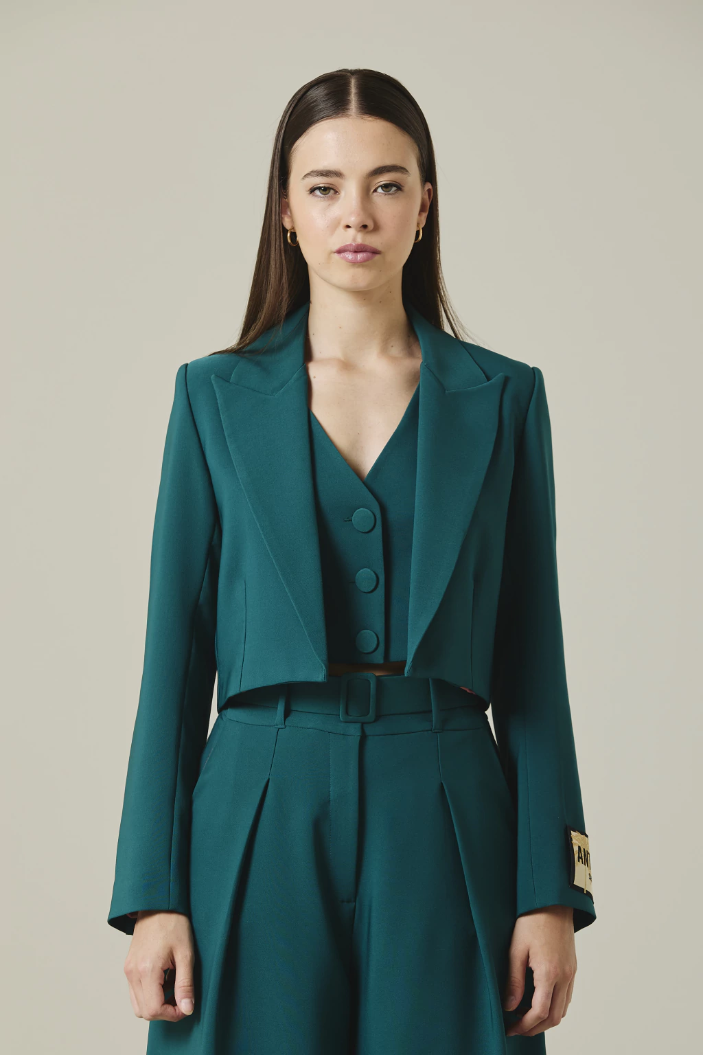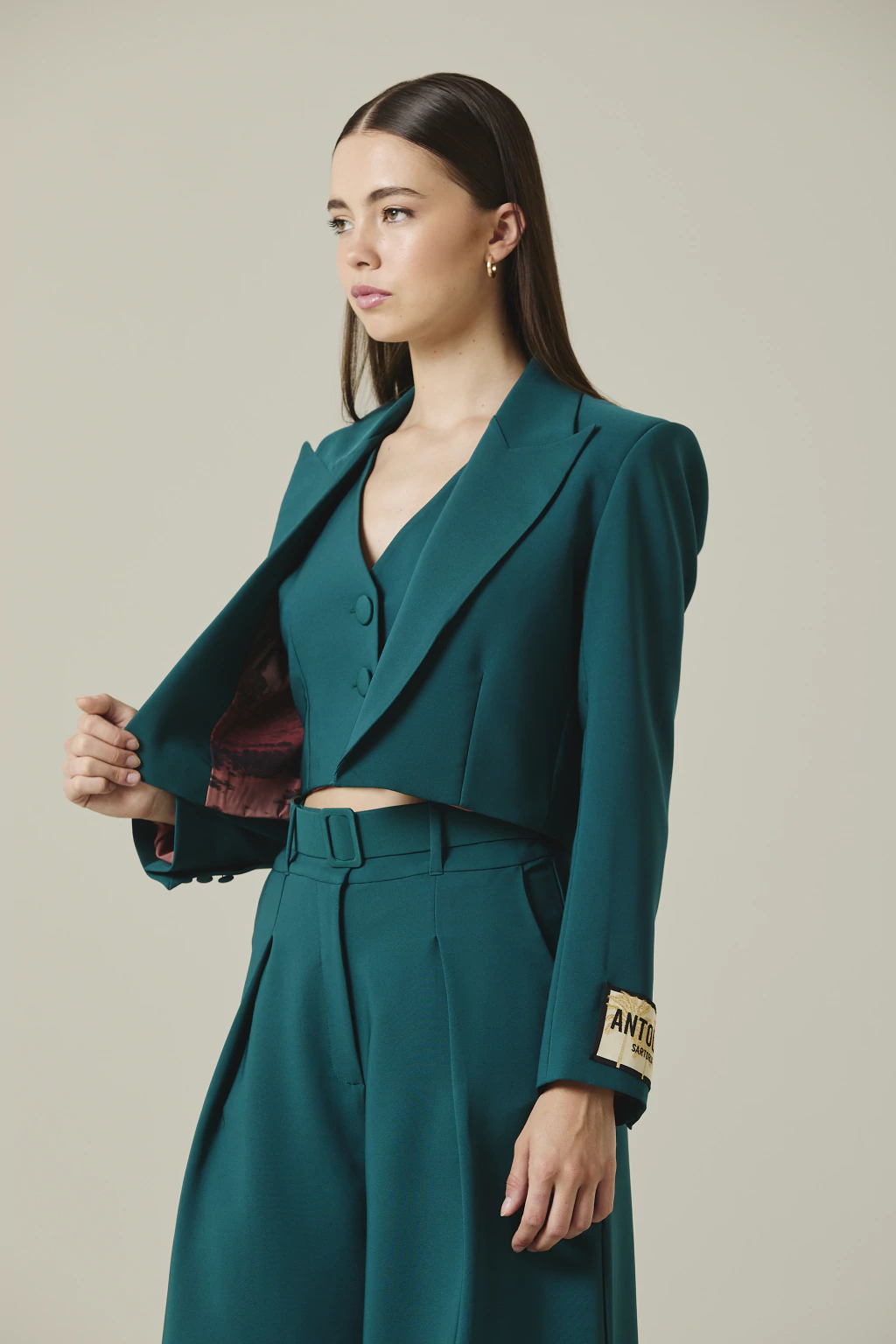 Este spencer, confeccionado en creppe sastrero, combina elegancia y modernidad en un diseño clásico. Su forrería estampada añade un toque exclusivo y distintivo, perfecto para quienes buscan destacar con estilo.