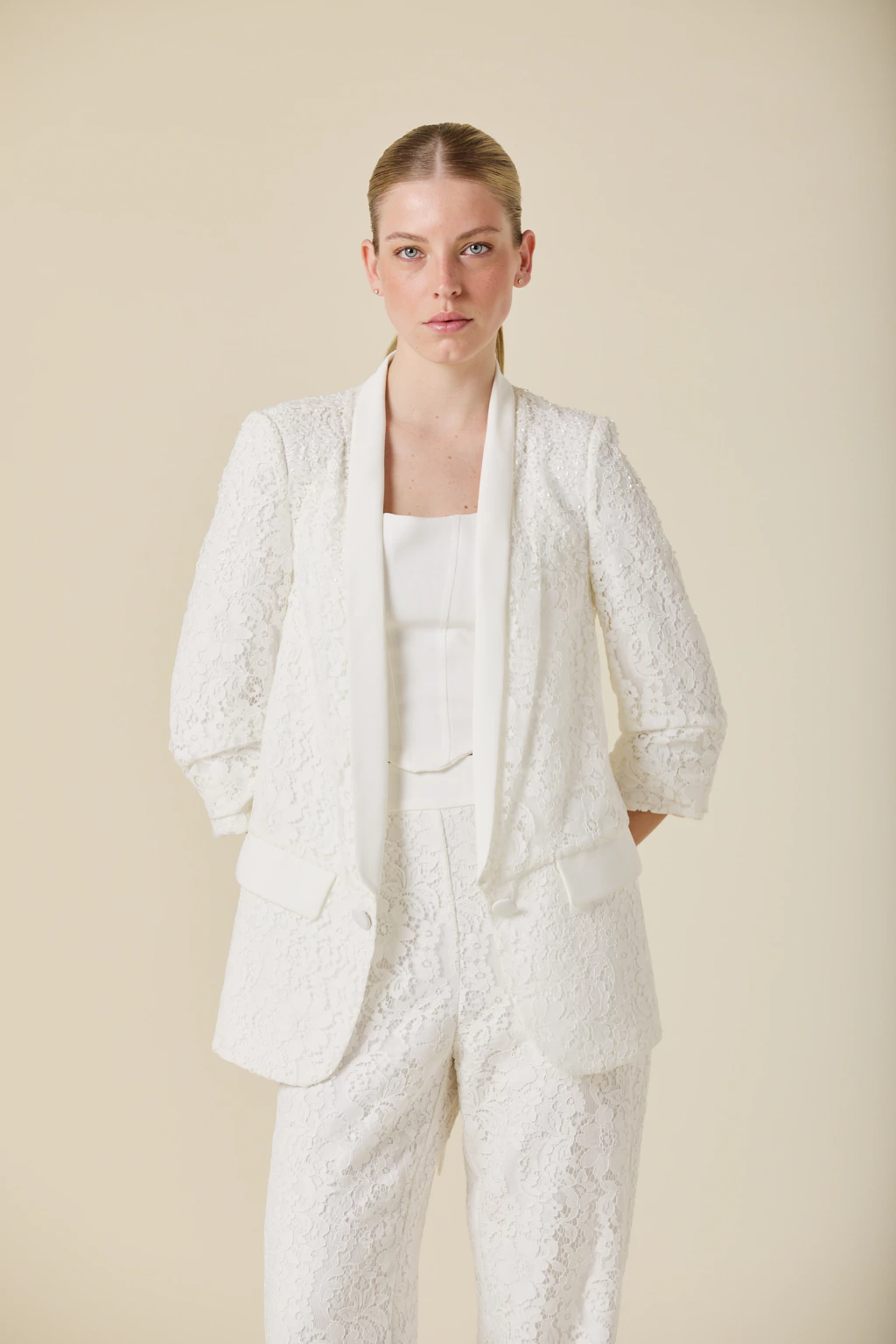Este smocking de encaje forrado redefine la sastrería con un equilibrio perfecto entre estructura y delicadeza. El encaje aporta textura y feminidad, mientras que el forro en creppe sastrero brinda cuerpo y comodidad. Los hombros realzados con canutillo al tono y las mangas arremangadas suman un guiño moderno, ideal para elevar cualquier outfit con elegancia y actitud.