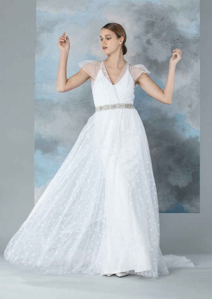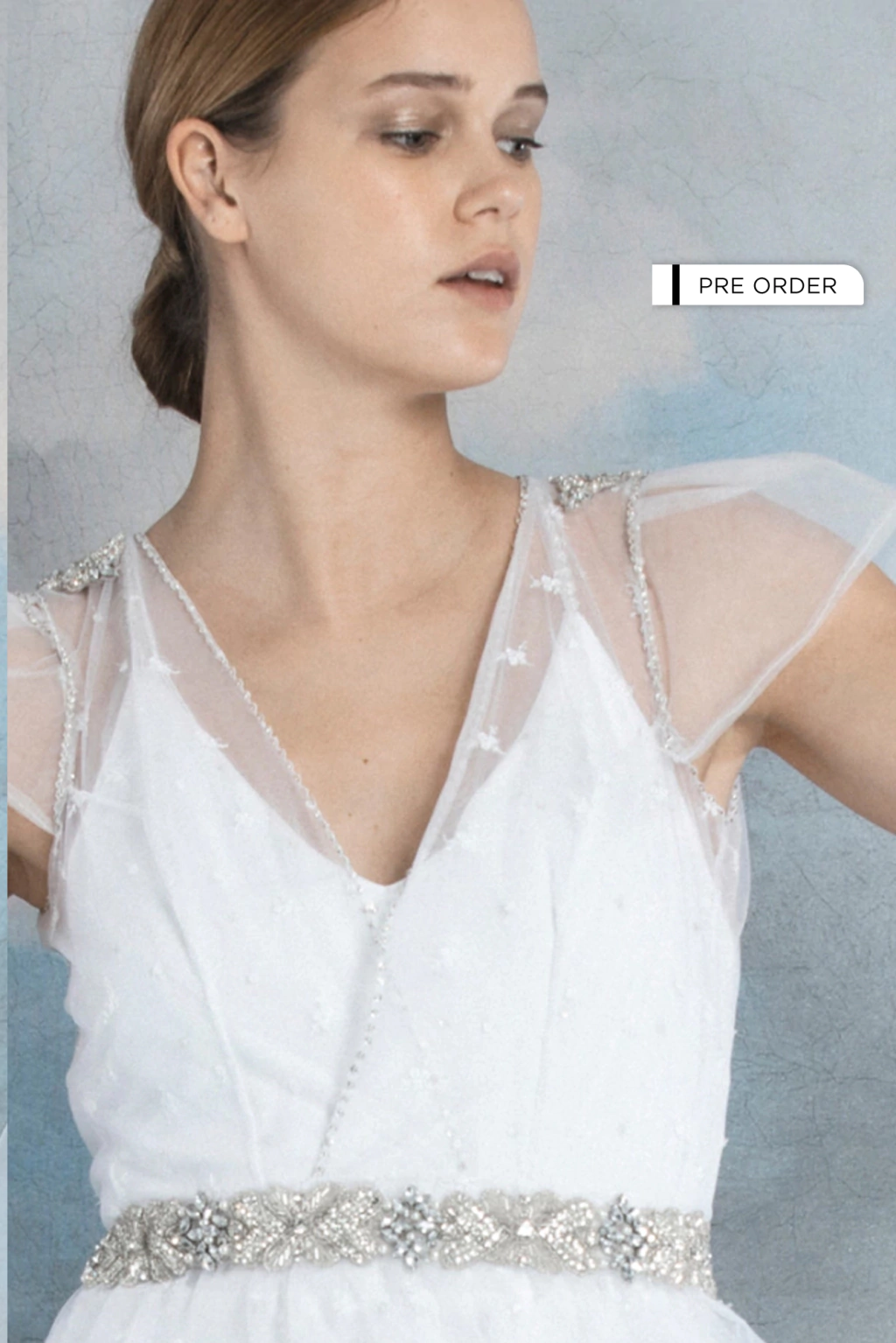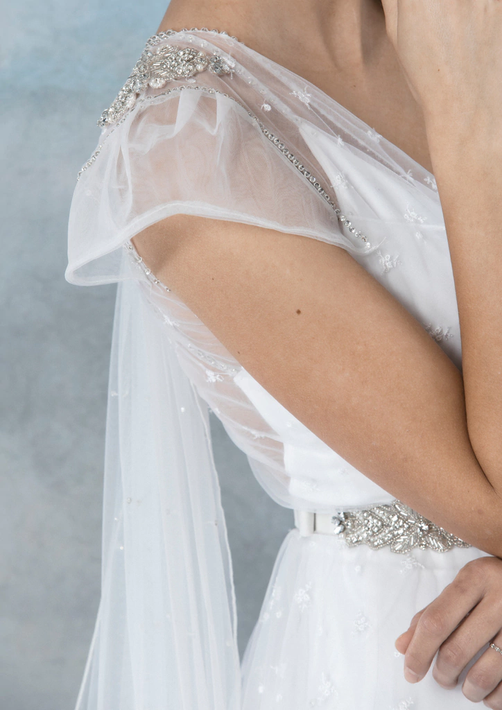 Aplique largo simétrico hecho en strass, mostacillas, piedras y canutillos largos.