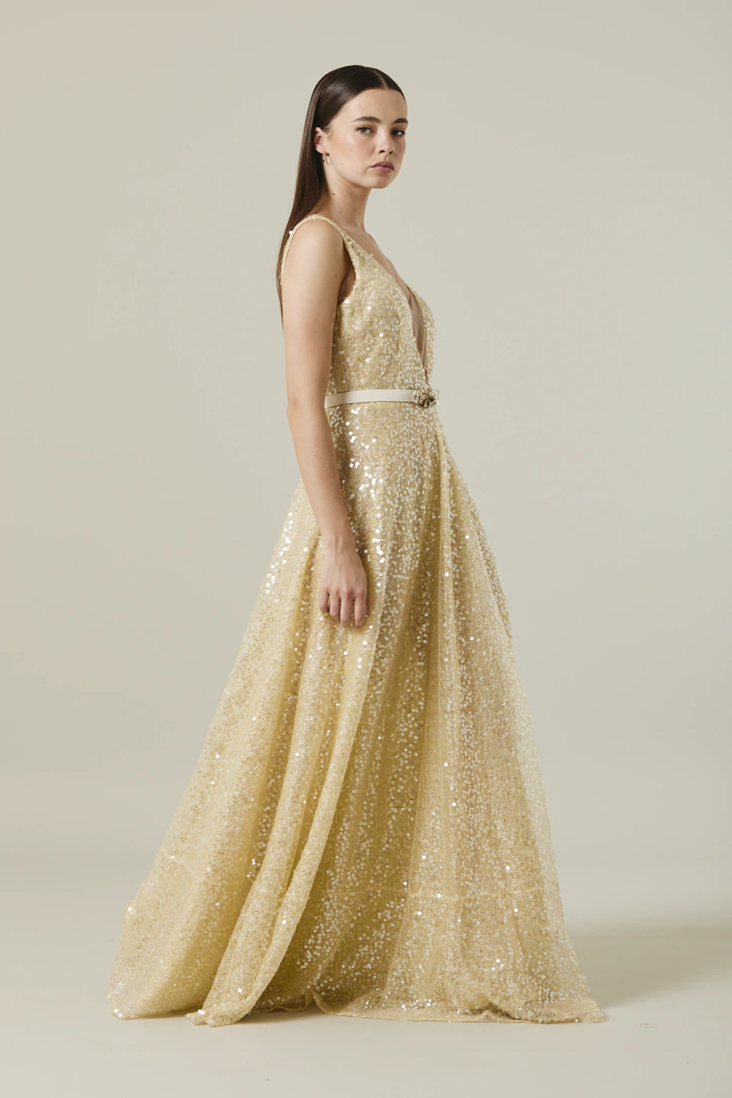 Este vestido largo de tul con lentejuelas es la opción ideal para brillar con elegancia. La fluidez del tul se combina con el toque de glamour de las lentejuelas, creando una prenda que destaca en cualquier evento. Con un diseño delicado y sofisticado, este vestido es perfecto para hacer una entrada memorable.