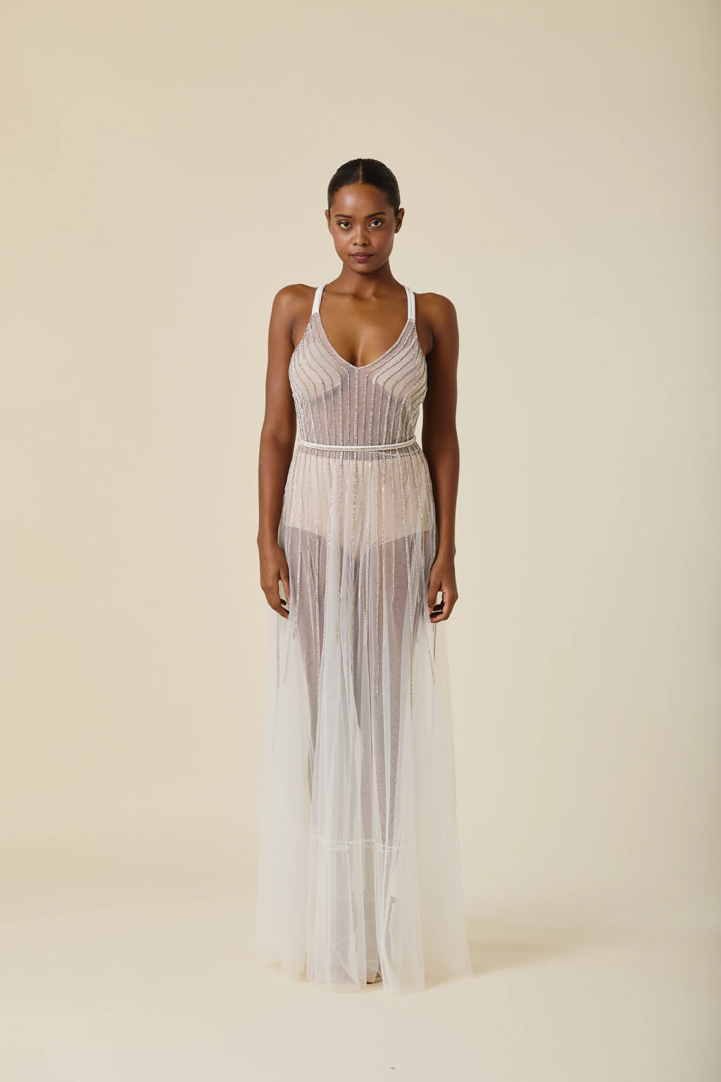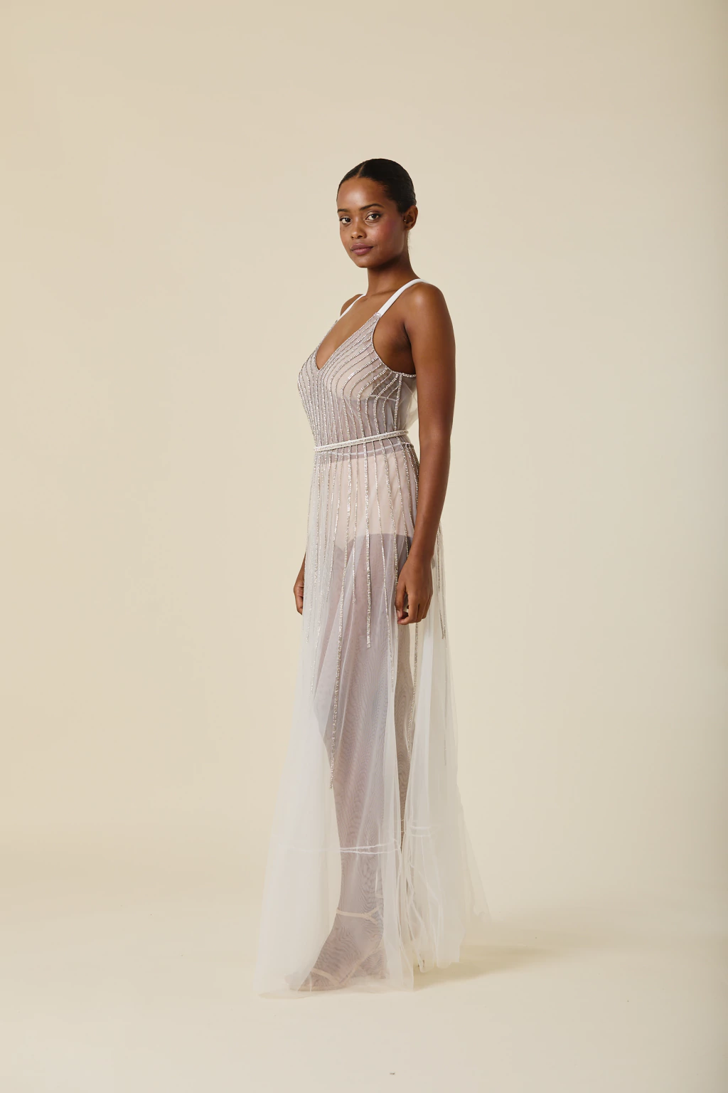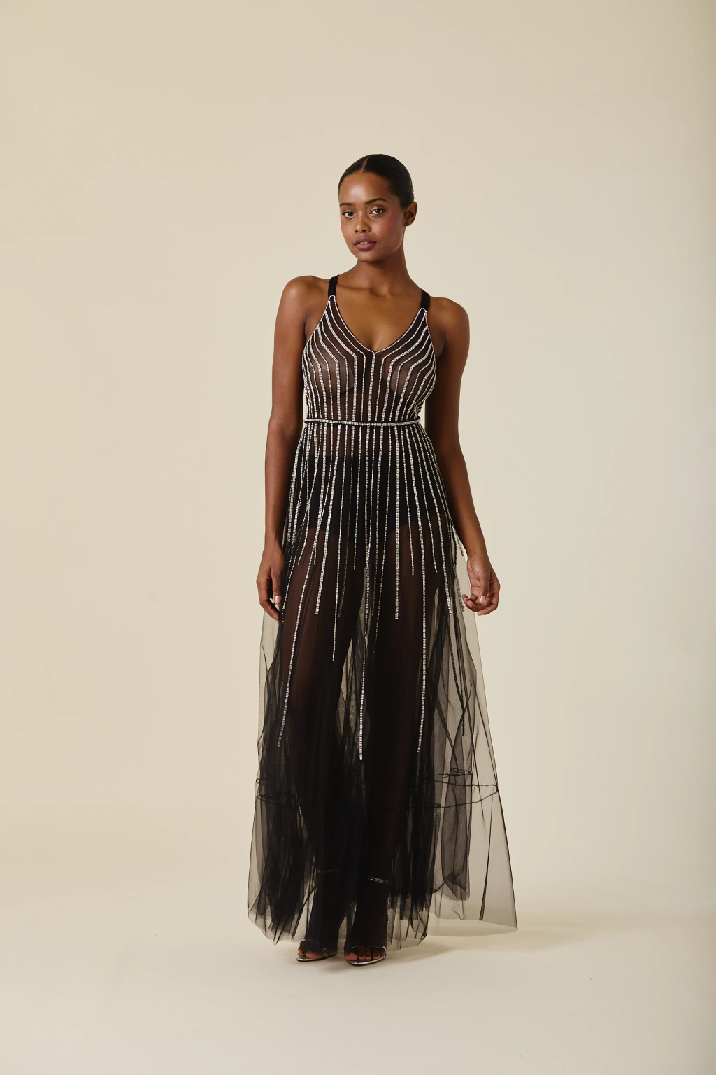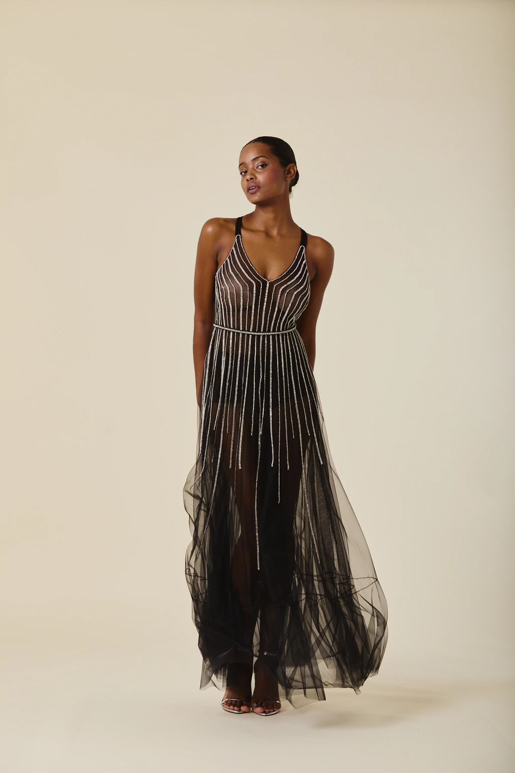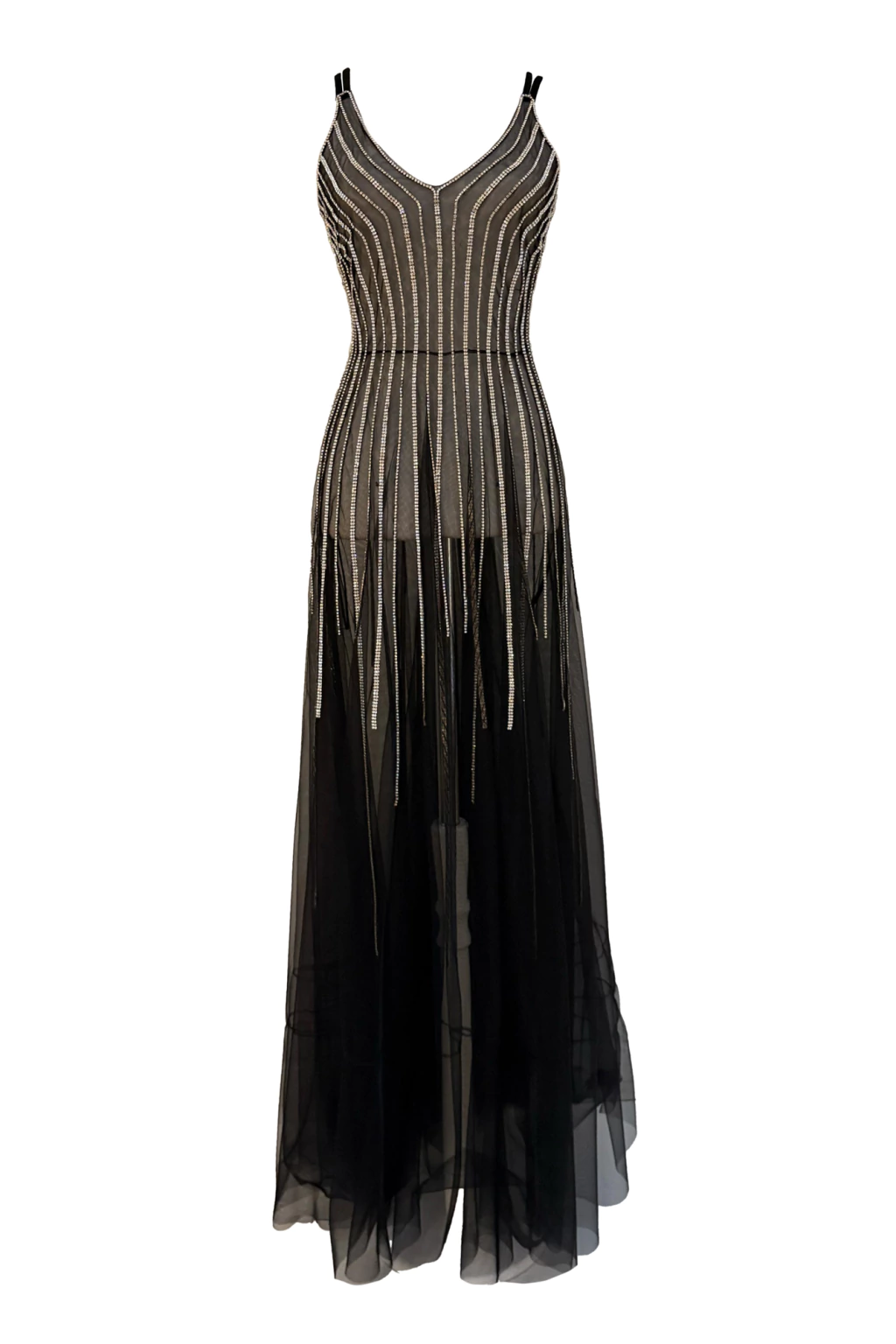 Este vestido largo de tul translúcido es una pieza deslumbrante, donde la delicadeza del tul se combina con la sofisticación de los bordados a mano. Los detalles de cadenas de strass cristal, tanto simples como dobles, adornan la prenda con un brillo sutil que resalta en la luz, creando un efecto cautivador. Sin mangas, su diseño fluido y etéreo ofrece una silueta elegante, mientras que el bordado a mano añade un toque de lujo artesanal y exclusivo, haciendo de este vestido una opción única para ocasiones especiales.
