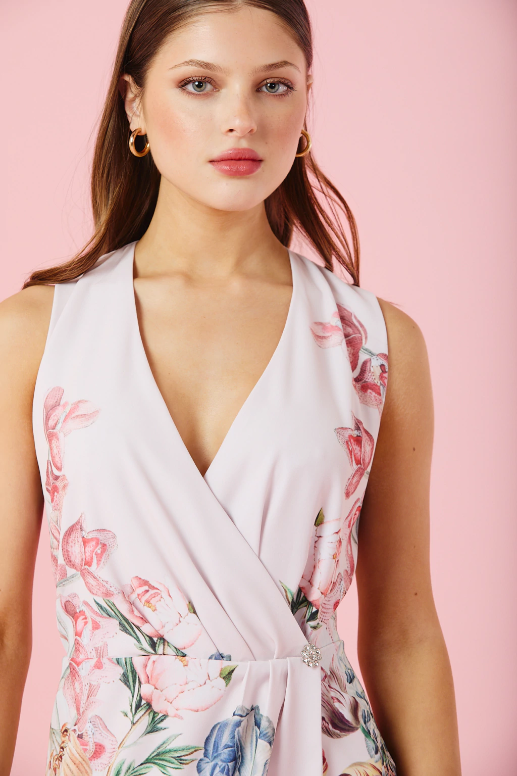 Este vestido combina la frescura del corte cruzado con la intensidad de una estampa floral exclusiva, logrando una silueta femenina y vibrante. El escote en “V” alarga visualmente el torso, mientras que la falda evasé aporta movimiento y liviandad. La base satinada con leve brillo realza los colores y el diseño botánico.
