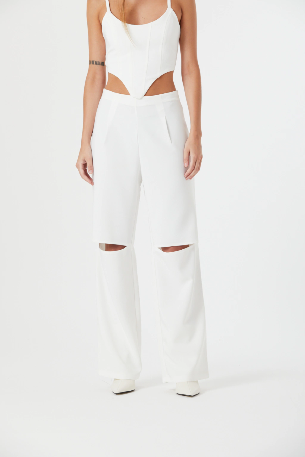 Pantalón largo con un diseño moderno y atrevido, presenta pinzas que aportan estructura y estilo. La abertura en la rodilla añade un toque vanguardista, creando un look contemporáneo y a la moda. Confeccionado con atención a los detalles, este pantalón es perfecto para quienes buscan destacar con un toque de audacia en su vestimenta diaria